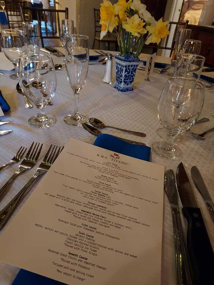 歴史ヲタクの会の主催するお食事会で、お題は「タイタニックごっこ」。タイタニック号の一等席の晩餐会で振る舞われた料理を再現してみましょうという企画。お客さんは乗船客のふりしてコスプレで参加することが推奨され、皆さん、どっから調達してきたのか、1912年ごろの上流階級のお金持ちさんの装いでご登場。救命胴衣をお召しの方も。