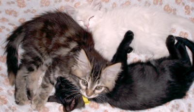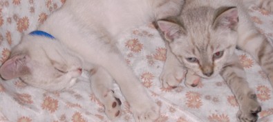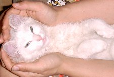 会員番号 95番 ゆき です! (うわ~~約20年前のおにゃン子くらぶをイメ-ジしている私は、年がばればれですね!笑。)こんにちは~!CIAO!ご無沙汰しております。白いから、ゆき。と名づけられてしまったのですが、超甘えん坊。抱っこが大好きで、いつも走って、家に入ろうとして、のどをならしながら甘えるのが得意。(いつもみんなのいるガレ-ジから走って、台所のある扉まで来ます)2匹のシャム雑種の子分(シナモンとパウラ)とは、仲良く遊べるようになったんだけど、今週末、いきなりきた(次回の日記で紹介)MことMAC(マック)の小生意気なおちびがきたときは、すごいナ-バスになったわ!なんだか、みんなに当り散らしてしまったけど、私のこと一番かわいがってね!手のひらで転がしたいけど、ちょっと大きいかな~?~?ひざの中でコロコロ!!疲れちゃった~。けど、家のソファはやっぱり気持ちいいわ~。~~~番外~~~はじめまして!気さくさが売りのシナモン!です。だれとでも、どこでも仲良くなれてしまうのが、僕の特技!そして、みゃお~とないて、なでなでしてもらうんだ。なんだか、たくさんのお姉さんたちが遊んでくれたり、臆病だけどとっても僕より体格がよくって、気が強いマイペ-スの兄弟は、僕とばかり遊びたい。っていつも遊んでいるんだ。でも、食事のときにいつも独り占めにしようとするんだよね。copyright @ il marito di piccolai