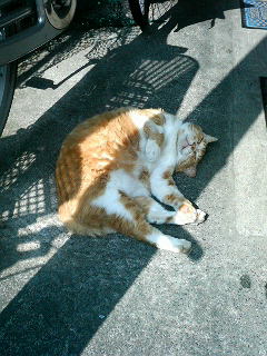 この間、道端を歩いていると、可愛い寝姿の猫に会いました♪思わずですね。スーツ姿でしたが、道端で携帯電話で写真を撮っちゃいました。「可愛いですね写真撮りたくなりますよね」と声を掛けられ、見ると綺麗な女性が携帯を構えて、待っていたんですよ。「そうですよね♪」と思わず相槌は打ったんですが・・・この人は、いつから俺の背中を見てんだと思った瞬間、さすがに恥ずかしくなり、逃走しちゃいました。いやぁ~彼女がいなかったら、「この後お茶でもどうですか。」と・・いやいや、素敵な出会いでしたそんな女性・・猫と話をしてみたいと、猫じゃらしを普段から持ち歩こうかと考える俺です。
