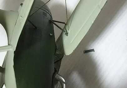 エンジン、プロペラ、爆弾、後部機銃を取り付けようとしたところで、約30cmの高さから取り落として、翼間支柱の一部が折れて上翼が外れてしまいました。
