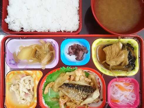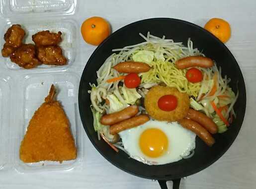 角蒲鉾のがんす、ミニトマト、めだまやきを添えました。