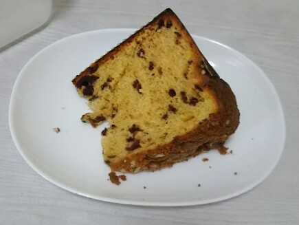 アマレーナ(チェリー)の砂糖漬け、ダークチョコレート、アーモンド、ヘーッゼルナッツの入った生地でのパネトーネです。