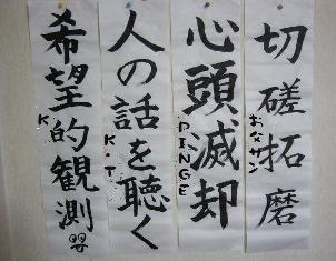 明けましておめでとうございます。午前中は、かなり自己流入ったお雑煮を食べ、コドモ達へのお年玉は、「現物支給」。希望のゲーム関係。自転車で近所の神社にちろっとお参り。ムラの支部の武道始めがあり、参加時間は自由と聞いていたので、午前中の後半に入ろうと出かけたら、情報不足で稽古は終わりかけのところ。( ̄□ ̄;)!!ガーン知らずにワタシ(運転手)は、ぷらぷら散歩し(ケイタイも家に忘れたので)行方不明状態になってしまいました。アハハ(´▽`;)午後は、宿題を処理する意味でも、「書き初めをしなさい」とコドモに命じました。T坊は鉛筆で詩を書き写す「書き初め」でしたが、K兄ィはやたらデカイ長半紙をもらってきて、毛筆で書く宿題でした。紙は2枚もらってきて、よくできた方を提出するのだとか。K兄ィの事ですから、練習なんかするわけもなく、「どの紙に練習すンのよ。」去年の宿題用に買った長半紙を出してきましたが、全然大きさが違う。うち、新聞取ってないし(爆)ほとんどぶっつけ本番です。まいっか。一枚目、春の字間違うし。(爆)オッケーオッケー。硯に墨滴が残っているので、去年の半紙に私も書き初めをしました。ハーッハッハッハッ意味はあまりありません。フィーリングです。(爆)