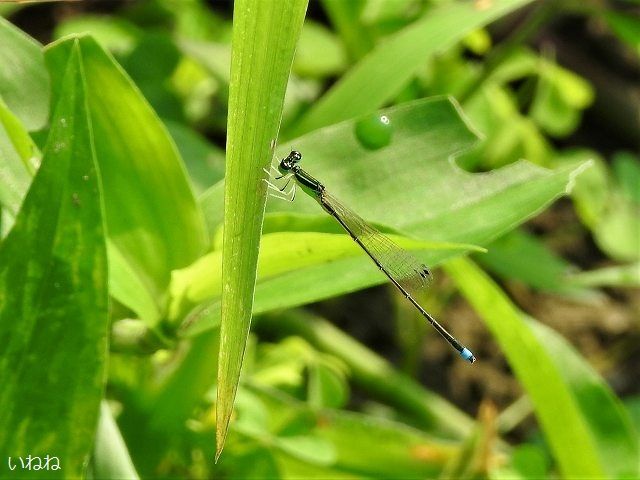 畑の雑草の間を何か虫が飛んでいるのを見つけました。細い糸みたいなトンボです。名前は、よく似たのに「アオモンイトトンボ」がいますが、お尻の先の水色の部分の位置と大きさで「アジアイトトンボ」となります。撮影;Nikon_coolpix-p900アジアイトトンボ;トンボ目、イトトンボ科、L=30mm