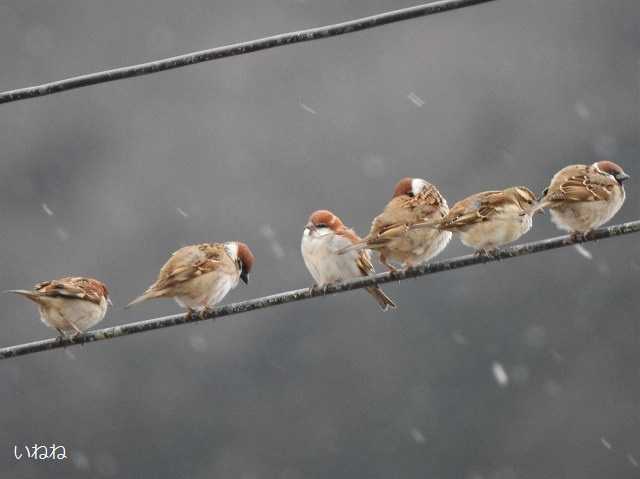 今朝は雪がちらつく寒い日になりましたが、風がないのでウォーキングに行くことにしました。途中で電線にとまる沢山の「スズメ」の群れに遭遇しました。その群れの中に数羽の「ニュウナイスズメ」が混ざっていましたが、争いが起きる気配はありませんでした。ニュウナイスズメ;スズメ目、ハタオリドリ科、L=14cm、漂鳥画像1_右端と左から2番目と4番目の3羽はスズメです。画像2_右から2番目がニュウナイスズメのメスで、4番目がオスです。画像3_左がスズメで、右がニュウナイスズメのメスです。画像4_山は雪で霞(かす)んでいました。