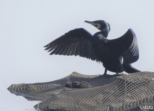 風が吹いてくる向きに羽を広げている「カワウ(河鵜)」です。なぜ羽を乾かすのかを調べてみました・・・<こたえ>カワウは水に潜るのが得意な鳥ですが、そのために体の秘密を持っています。普通の鳥は羽に油を塗って水をはじくようにしていますが、ウのなかまの羽は油を塗らないため水をはじかない。そのために水に入っても、浮力が少なくなって潜りやすいのですが、そのかわり水中で行動していると羽がびっしょりぬれてしまうから、水から上がった時に乾かす必要が出てくるのだそうです。上手に潜るために、羽を乾かす手間が掛かっていたんですね!