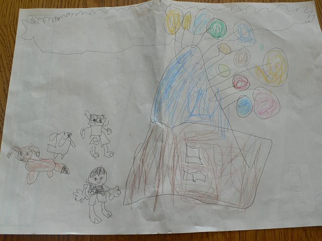 月曜の帰宅後に発熱した次女(3歳8ヶ月)病院受診後に痙攣を起こし、インフルエンザ脳症だったらどうしよう!!とパニックに陥りましたが、幸いすぐに治まり、意識もしっかりしてたので一安心熱性痙攣もちの次女。これで4回目かな?以前、2回目の痙攣後、脳波検査などもしましたが異常も見つからずでした。前回の痙攣から半年~一年くらい経ってたので、もう大きくなったし大丈夫かなと思ってたので、ショックでした小学校上がる頃まではまだまだ、安心してはいけませんねダイアップ入れて、タミフル飲ませて、翌日には熱も下がり、元気になりましたしかし、初めて使用しましたが、タミフルってすごい効き目ですね。異常行動や意識の混乱や心配されるようなことは起こらず済みました。耐性が付くのが怖いので、できれば薬に頼りたくないのですが(下水処理水からタミフル成分、鳥飲み耐性化の恐れ…京大分析 という記事が過去にありました)さすがに脳症はリスクが大きすぎです。念のため今日も次女はお休みしてますが、幸い家族の誰にもうつらずに済みました本当によかった!!次女は毎日、DVDばかり見てて・・・カールじいさんの空とぶ家メガネをかけてるおじいさんとバッチをたくさん付けてる男の子なかなか上手に描けててウケましたカンフーパンダ師匠がちゃんと杖を持ってますアンパンマン ウサギみたいなのがバイキンマン毎日毎日、次女は絵ばかり描いてます