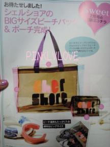 こんばんは~(^-^)先ほど帰宅~(^.^)b最近、学校の勉強に疲れてますo( ̄ ^  ̄ o)昨夜も夜中2時まで自宅学習してました…更新も出来ず、読み逃げしてごめんなさい(-人-)待ちに待った★Sweet★買ってきたよ~(*´∇`)★Cher Shore★のビーチバックとポーチ♪今月号は完全に付録狙いでした~(*´∇`)大きいのでたっぷり入ります~(^.^)b普段使いにしたかったのですが大きいからジム用にもいいかも~(^.^)bって…ジム休んでいますが…(≧▼≦)