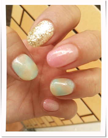 頑張って 行って来ました♪素爪で過ごしていたから…赤ちゃん爪のように短いからyellow×ミントのタイダイとPINKグラデ に ラメおとなしめに仕上げてもらいました♪でも ご機嫌です( v^-゜)♪
