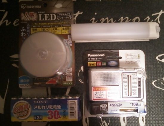 こんにちは♪台風 直撃しそうですね><前回の台風の日記 にも 書きましたが21号の台風では 丸1日 停電したのでそれは それは 不安で恐ろしい時間でしたその後 防災時の備えを 買い揃えている最中でしたが台風や地震などの影響で手動式ラジオや手動式ランタンなどの 防災用品注文しましたが 納期が12月以降で・・・今回 近畿がまた直撃しそうなので買い足しましたLEDセンサーライト・電池式ラジオ・電池30本こちらの LED の センサーライトは6月の引越しの際 大工の知人に入居時に 4つ 天井に つけて 貰っていたんですがすごく助かりました乾電池式なので 停電時もばっちり活躍こちらですこちらがうちのキッチンの天井に2つ ついている画像です薄明かりですが これで 真っ黒には なりませんでしたセンサー式なので 居なくなると消えてしまいますが問題ないと思います実は電池式にしたのは 防災のためではなくコンセント式・スイッチ式のセンサーライトにするには天井をめくるか露出配線をしないといけないので費用を抑えるためですが停電時に活躍したので大正解でしたあと こちらは スイッチの切り替えで 点灯し続ける事も可能ですしマグネット式なので 本体を簡単に取り外せて持ち歩けるのも 良い点です卓上に置いてもよしトイレに持って行っても良しとなので 1つ買い足して 防災リュックに入れました全部で5個になりましたが一晩 暗闇で過ごした恐怖でトラウマがあるので今回 細長いタイプを2つ買い足しました卓上に置いて使用予定ですこちらですがこんなタイプもあるんですねこれも 廊下や寝室に良いかも買い足そうかな^^あと 一番困った 携帯の充電は電池式をコンビニで買ってきてもらいました停電後は どこも 売り切れでやっと やっと 昨日 入手 できました早く こちら 届いて欲しいなぁ・・・大きな 被害が無い事を 祈るばかりです・・・