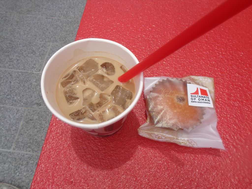 イートインスペースはないので、パビリオンを出た所の椅子に座っていただきました。ラテはシロップが入っていて優しい甘さでした。ラズィーズルブティーンはいちじくジャム入りでした。