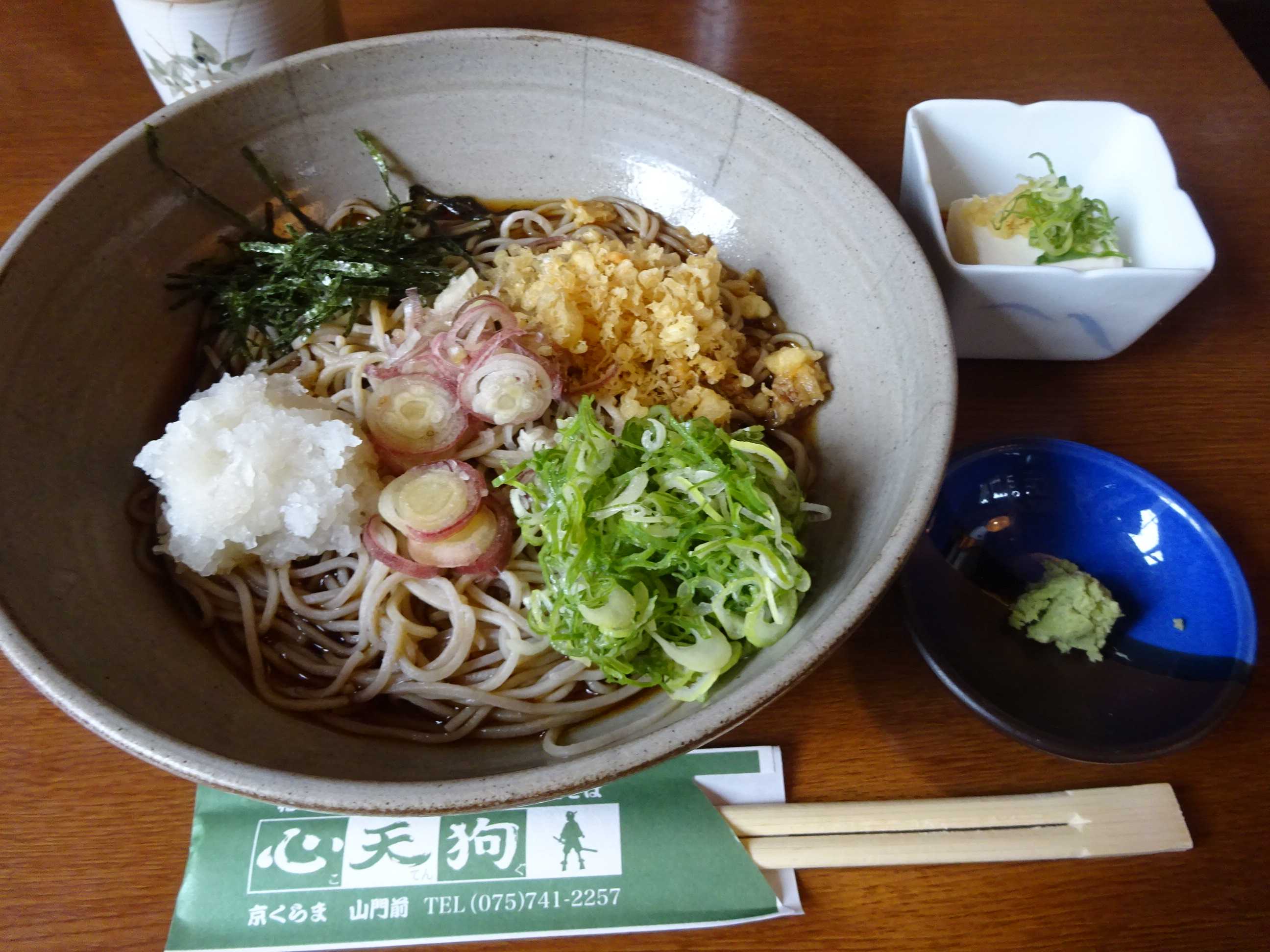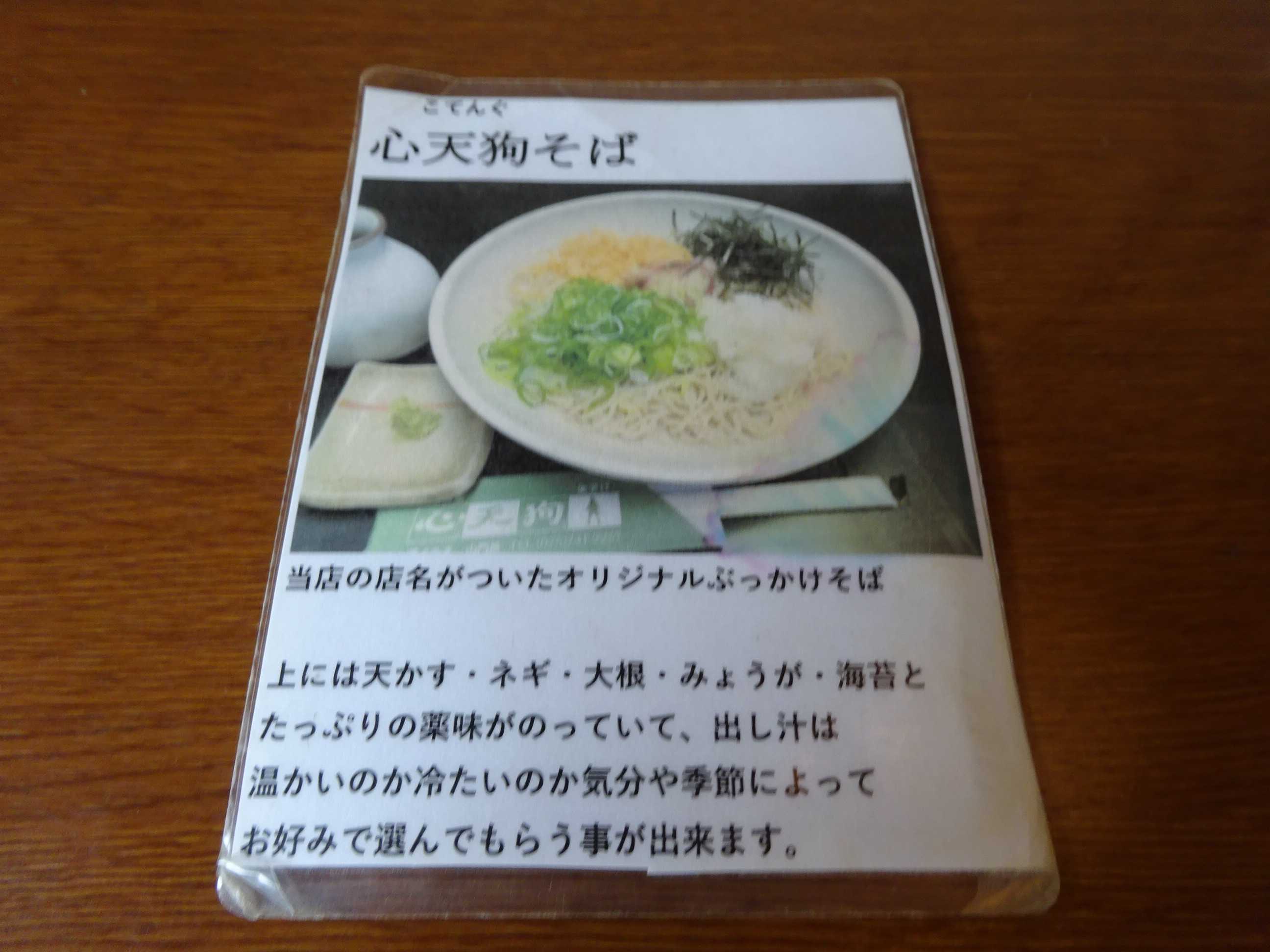 心天狗そばをたのみました。ねぎ、天かす、海苔、みょうが、大根おろしといろいろな薬味がのっているそばにつゆ(温かいのにしました)をぶっかけていただくぶっかけそばです。おいしかったです。
