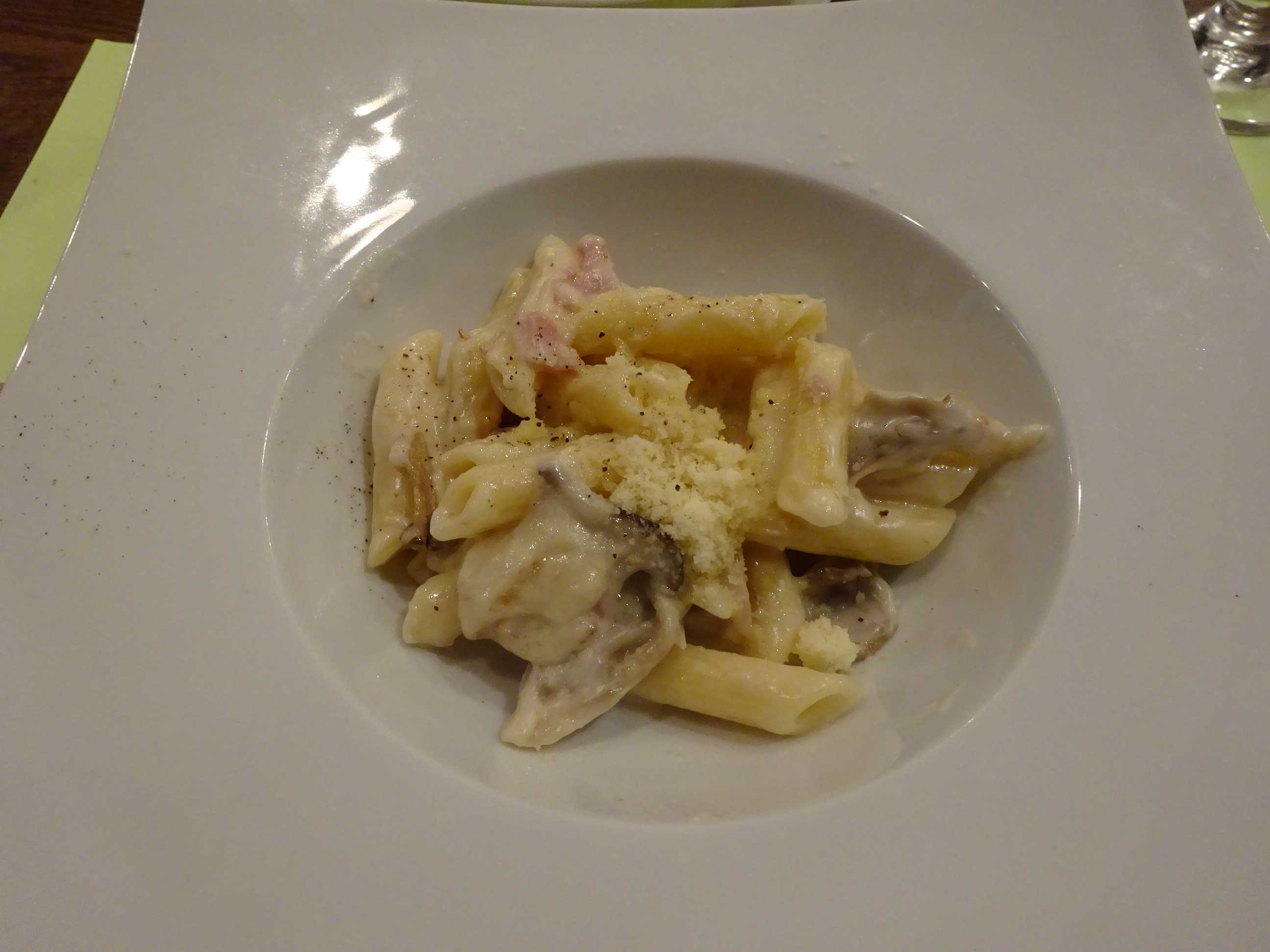 パスタは、きのことベーコンのクリームのペンネにしました。