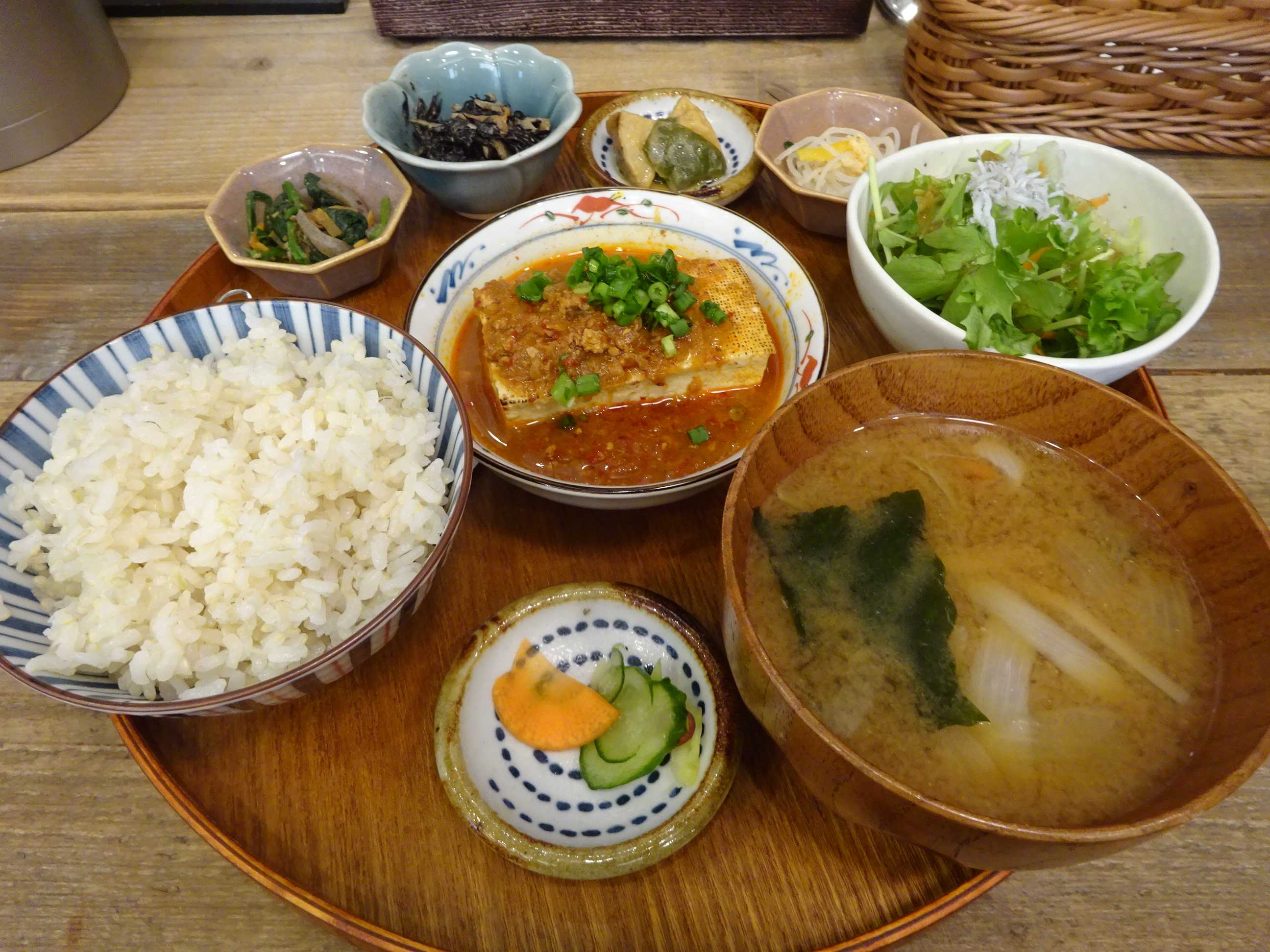 日替わりの主菜は麻婆豆腐でした。手作りのお惣菜4種、しらすと4種類のサラダ、漬物、胚芽米のご飯、季節の味噌汁