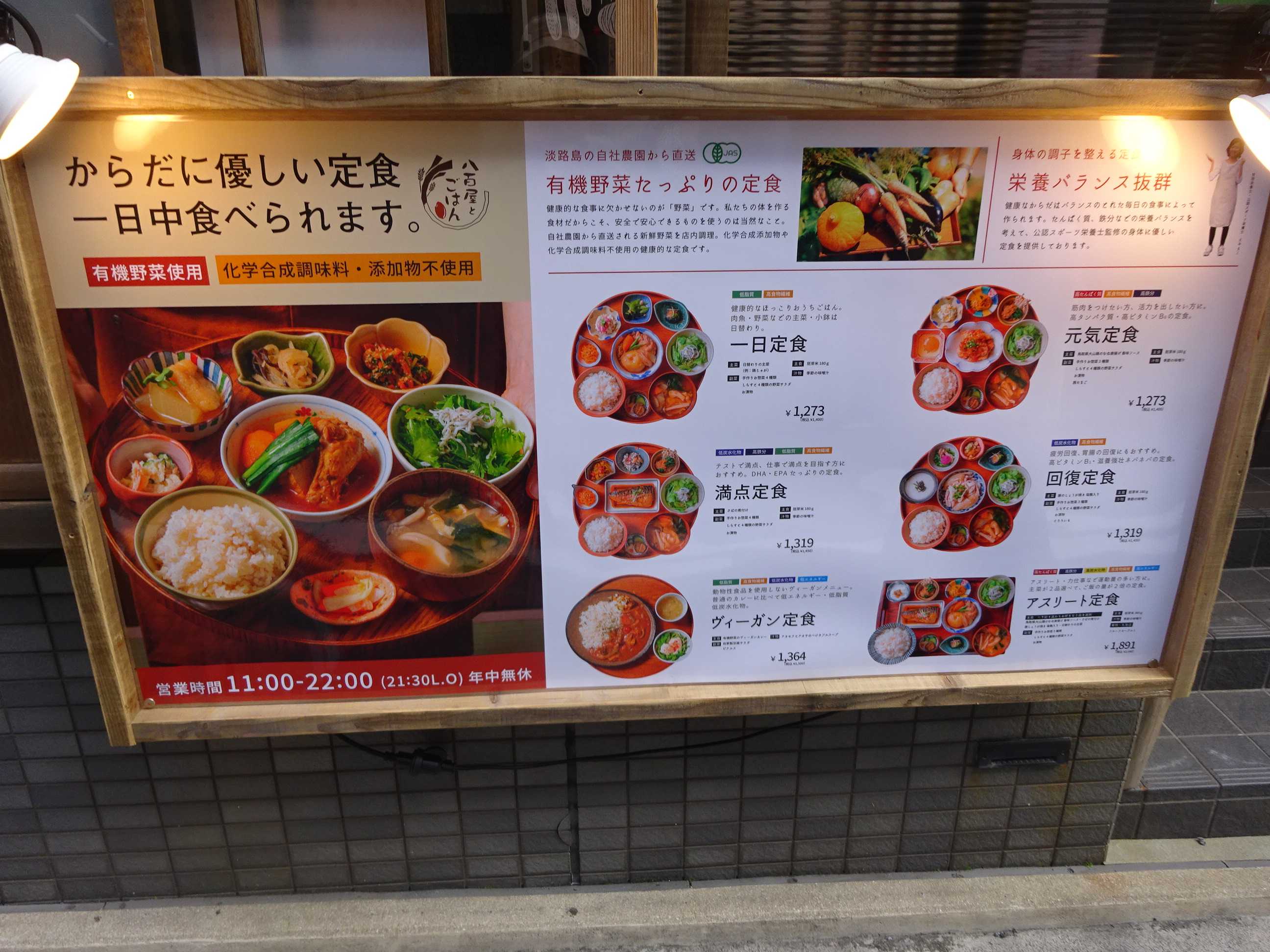 有機野菜をたっぷり使ったからだに優しい定食が1日中食べることができます。