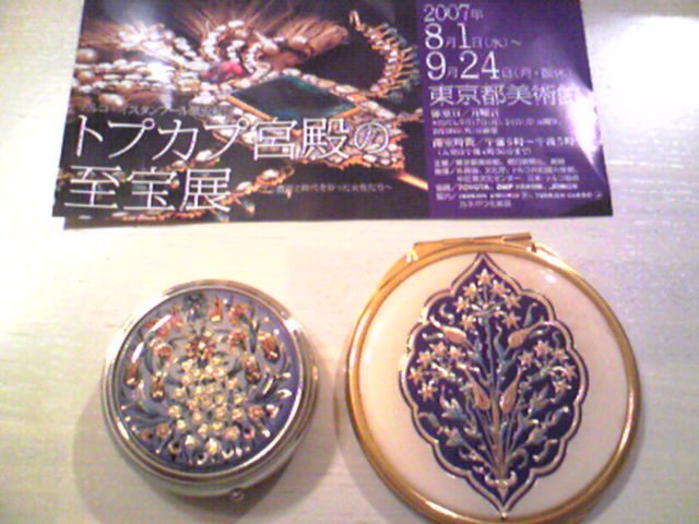 今日は「トプカプ宮殿の至宝展」に行って来ました♪さすがに土曜日だけあって、凄い混雑ぶりでしたが、金銀財宝はもちろん、本物の武器や防具の展示もあったのでかなり興奮しました(笑)マダムのみなさんは、200カラット以上のエメラルドに夢中でしたが、私は本物の「こんぼう」「くさりかたびら」「金の盾」を目の当たりにして感動してました。こんぼうって、英語でmaceですから形も想像できそうな物なのに、ドラクエのこんぼうに限っては、特大すりこぎ棒みたいのを想像してました…。展示品は、上階級専用の武器なので、金の細工や埋め込まれた貴石が見事でした。オノもダガーも煌びやか!人の流れが速いので、もう1回戻って武器コーナーだけ見て回ったくらいです。東京都美術館で今月24日まで開催中です。もう1回見に行こうと思ってます(*^^*)お土産コーナー、さすがに武器のレプリカは置いてませんでした…。小物のレプリカがあったので、ミラーとピルケースを購入。数ある金細工の中で、一番印象的だったのは、「金のゆりかご」!ゲームのレアアイテムみたいな名前ですが、純金にエメラルドやルビーが埋め込まれていて、総カラット数は500以上!そして虫眼鏡で見ないとわからないくらいの、細工が全体に施されていました。ハレムの女性達が身につける、髪飾りもありました。金のヘアバンド、本気で作ってみたいです…純金パーツを幾重にも編みこんで作られているんです。防御力も高そう!(´△`)この美しい装飾品を世に広めて行ったのもこの女性達と言われています。いつの時代もモードは女性が作るんですね(*^^*)