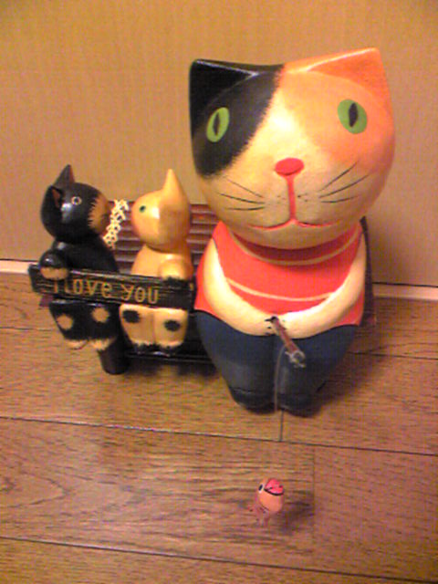 先日、地元の雑貨屋さんで購入したネコの置物。ミニベンチに座る姿がとっても可愛くて一目ぼれ。玄関に飾って守り神にでもしようと思ったのに……ぴのが怖がります。ものすごーく怖がります(T_T)テレビの画面の猪にもライオンにも戦いを挑んで行く勇敢なぴのなのに…洗濯機がグルングルン動いてても、平気で戦いを挑んでいくくせに…なんで、こんなチッチャイ置物が?!しかもネコ。大きいネコが持ってる釣竿にちょいちょいして遊ぶと思ってたのに、近寄りもしません。自分の振動でぐらぐら動かしてゴトン!って落とした時なんて、音速より速く移動して2時間出てこなくなりました(´△`)う~ん。恐怖ポイントが全くわからない。仕方ないので、目の届かない書斎のすみっこに放置してあります…。ネコ~…('A`)