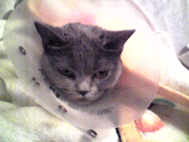 ぴのが2泊3日の避妊手術を終えて帰宅しました!いや~もう~さみしくて…預けに行く時なんてぴのもひよこも大騒ぎで…動物病院の先生にとってもお世話になりました…('A`)何回置いていっても、ぴのは後追いかけてくるし。たった3日が50年くらいに感じました…。長い。今日の夕方迎えに来てください~と言われて、猛ダッシュで行って来ました。我ながらマラソンランナー並のランニングでした。自転車より速かった。薬や手当ての方法を聞いて、エリザベスカラーを1週間ほどつけたままにしてくれと言われ…はて…エリザベスカラー↓こんなものを、あの子がおとなしく着けているんだろうか…。一抹の不安!そしてご対面~「誰よアンタ」って顔…ちゃんと着けてる。なんだか素っ気無い…。先生曰く、入院がショックだったのか、ご飯を全く食べないんですよ~、と。置いて行かれたと思ったのか、相当いじけちゃってます、と。自宅に戻れば元気になると思うので、様子見て下さいと言われて帰宅。いつもだったら、ニャーニャーギャーギャー大騒ぎの帰路なのに、し~ん としていて居るんだか居ないんだか。子供の群れに遭遇しても「ママー!トラがいるよー!」と言われる事も無く。部屋に着いて、キャリーを開けたまま、そっとしておいたら10分ほど家中を探検して、思い出したかのようにソファに寝転がりました。そしてお腹が空いているのに気づいて3日分くらい一気に食べる食べる!!寄り付きもしなかったのに、やっとそばに来てくれました。お腹の毛が無いから、毛布でぐるぐる巻きにしてみました。あったかいみたいで、ずっとゴロゴロ鳴いてる。ぴの専用のひよこ毛布。抜糸まで1週間です。カラーが邪魔で歩くのにもひと苦労みたいです。考えに考えて、手術を決意しましたが、何はともあれ無事に終えて帰って来てくれて良かったです。傷が良くなれば、また暴れぴのに戻るのかなぁ。