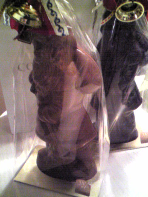 すっかり忘れていました…今日はクリスマス!昨日はイヴだった。フィルムをかけたままなので、ちょっと見難いですが…チョコレートのサンタさんを貰いました。なんと、高さ60センチ!!2体並ぶと、かなり迫力あります!これ、どうやって食べればいいの…。とりあえず、会社に飾ってあります。賞味期限が2月9日というのも微妙…せめてバレンタインまで持ってくれれば、そのまま全員で割って食べるのに。でもこんな大きなサンタさんを割るなんてちょっと残酷。かといって、湯煎で溶かすのもイヤだ…。う~ん。チョコレートフォンデュもいいかなと思ったけど、ぐらぐら煮える中、溶けていくサンタさんを見たくない。困った!誰か良いアイディア下さい!!