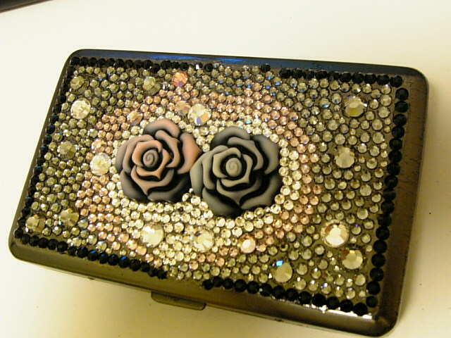 1週間、寝る前にコツコツコツコツ貼って貼っての繰り返しで完成しました!!オンボロだったシガーケースがキラキラに蘇りました~(笑)特にデザインも何も決めずに貼り始めたので端っこが微妙ですが、御愛嬌(;^_^A使用スワロは、クリスタル・ライトアメジスト・ブラックダイヤ・ジェットのSS5・SS9を中心に、SS12とSS20を散りばめています。真ん中の薔薇パーツは、nailyasanのデコパーツ福袋に入っていた物です♪スワロもnailyasanで大量買い。薔薇周りを最初にやったので、まだ根気充分モードでSS5で細かく隙間を埋めてますが…最期の方、だんだんメンドーになってきてブラックダイヤが隙間だらけです……('A`)まぁ、使うの自分だし、いいかぁー。部屋の照明をかなり落として、やっと全面が写りましたが実物は本当にキラッキラのギランギランで、かなり眩しいです。私の中では大満足の出来!!こぐま(プロ)に見せたら隙間がぁぁぁぁ!!ってツッコミを受けそうです(´△`)プロに頼んだり、ショップで購入すれば素晴らしく綺麗な物を手にすることができますが、自分で頑張って苦労して試行錯誤して、多少のミスはあってもやり遂げたときの達成感ったら!愛着が沸いて良いものだなぁ…と思います。取れても自分で修理できるしね。今回は、こちらのデコボンドを使用しましたが…やっぱり2液式のほうが、しっかりキレイに貼れます。でも、私みたいにモタモタのろのろ貼ってくにはボンドの方が固まるのが遅いのでお勧め。はみ出すとベッタリして大変なことになるので、プレートに取って、楊枝かピンで細かく塗っていくのが良いです。次は何を作ろうかな~。