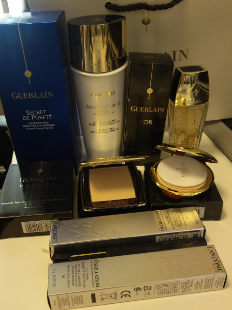 コスメティックフローラで購入したコスメが到着♪1日で届いたー。ゲランいっぱい早速使ってみました。まずはクレンジングミルク香りが好きですねー。そしてしっとりやわらかいテクスチャなのでするすると肌にのびます。ふき取りよりも洗い流しが好きなので、バシャバシャと…。つるりと落ちました。これは良いです。200mlの大容量でこの値段は凄い!携帯用のパウダーコンパクト。2番のパールにしてみました。濃いかなーと思いましたが、標準的なベージュなので大丈夫そうです。コンパクトは薄型なので、ポーチ内でもすっきり収まりそうですよ。パリュールクリスタルパール文句無しのカバー力&フィット感です。直しはほとんどいらないくらい、長時間キープします。しかも、ささっと薄くつけるだけなのに、この持ちの良さ!ゴールドの素敵なコンパクトなのも良い(*^^*)そして24金入りの下地!前回も書きましたが、肌がモッチモチのスッベスベになるのでファンデーションがピタっとついて、ますます崩れにくくなります。香水瓶のようなフォルムの容器が気に入って飾りたくなりました。これはリピート間違い無しです。で、最後にランコムの電動マスカラ。もっと、ブイイイイイイイイインって凄いのかと思ってました(笑)なので、飛び散らないようにケープまで用意してたのですが(どんだけ飛び散るんだ)見た感じではほとんど振動がわからない位でした。音はしますが。で、肝心の使い心地ですが…まつ毛の下からあてるだけで、上面からまんべんなく塗られる感じで良いです。で、少しキープしてから離すと、しっかりカールまでされちゃいます!うーん、これはビューラー要らず!そして仕上げのコームも要らず!ダマダマにもならないし、短時間でナチュラルな仕上がりに。マスカラでナチュラル仕上げって、意外に時間かかりますよね。ボッテリ塗るだけなら早いですが…。いや~大満足の買い物でした~。次はグロスとか、あと美容液とかクリームも買っちゃおうかなっ。