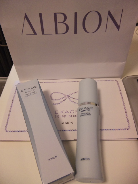 先日、グロスを購入した際にお直しでつけて貰ったミストがすご~~~く良かったんですよ。もう、歩きまわってグテングテンになっていたので相当テカりやヨレが酷かったと思うのですが(笑)見事にしっとりしたツヤのある肌に蘇ったんです。↓アルビオン エクサージュホワイト ホワイトニング エッセンスミスト 60mL ってことで、昨日のゲランに引き続き、早速買いに行きました♪これ一本しか買って無いのにエクサージュサンプル一式くれたよー。コンパクトサイズなので携帯にも便利!乾燥した時や化粧直しの度にシュってしてます。美白美容液なので、春先から使いたかったですねー。メイクの上からでも使えるのでオススメです。