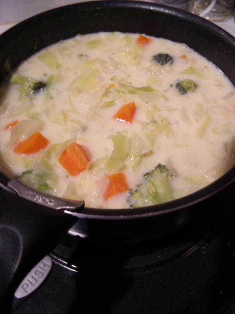 これです。「野菜たっぷり豆乳仕立てスープ」です。作るのめんどうだけど食べないと餓死しそうな時に出来上がりました。野菜をあるだけ出してきて、テキトーに切って、水を入れたお鍋へ。テキトーにコンソメ入れて味つけ。仕上げに豆乳をガーーーっと入れます。これだけなので、野菜さえ切ってしまえば他の手間はほとんど無いです。できるだけ色とりどりになるように…今回は・ウィンナー・じゃがいも・にんじん・ブロッコリー・たまねぎ・アスパラ・ニンニク・生姜が入っています♪冷蔵庫の残り物全部入れました(笑)水餃子とかお肉を入れても美味しいです。ヘルシーなので夜食にぴったり。いつもの食卓にもう1品!て時にも(´▽`)で、うちのキッチン、物が多いのか、元々狭いのかわからんですが料理しにくいので自分で改造してみました。これで料理スペースが広々!!!あんまり…というかほとんど野菜は食べないのですが(笑)これなら、ガッツリ食べられます(*^^*)