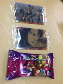 進撃の巨人のミント発売日なので買ってきました☆箱買いしようと思ったけど、まずは1個だけ(*_*)中身は女型の巨人だったので、同僚に取られてしまった(笑)私はミケが欲しいのよ~!!!エルヴィンでもいいのよ~!104期以外のキャラが出てきてくれて嬉しい!ミケが出るまで買い続けますわ(笑)ウエハースはいきなり金カードが出て狂喜してたのに、やっぱり取られるという(*_*)ついでにリヴァイも(*_*)でも後日ミケのミント貰えたので良かったです(´▽`)ミント缶がデスク内にギッシリになってしまった・・・!
