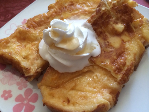 この前食べたフレンチトーストを参考に、自分でも作ってみました!いつも別皿に溶き卵を作って、パンを浸してから焼いてたんですけど、卵焼きトーストみたいになるのは何でかな?と悩んでましたが(笑)フライパンに直接溶き卵を作って(←!!!)パンを浸して、砂糖のかわりに甜菜糖のシロップを使用して、バターを入れてそのまま焼く!という強引な手段に出てみたところ・・なんか上手くできたー!(´▽`)ちゃんと表面はカリカリっとしてて、中はふっわふわ!バターが良かった?それともシロップかな?仕上げにシロップをもう少しと、生クリームを乗せて完成☆いつも適当に作るから、分量とかなんにも覚えてない・・忘れないうちにまた明日作ります(笑)