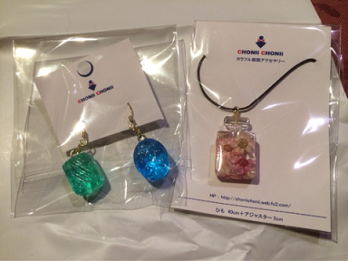 ふら~っと通りかかったお店で可愛いアクセサリーを見つけたので、こぐまとオソロイで買っちゃった(´▽`)ドロップのピアスとお花の香水瓶ネックレス!かーわーいー!他にも、金平糖のブレスレットとか、本物のお菓子を樹脂コーティングしたピアスとかいっぱい!キャンディのピアスは本当に可愛い~!こんなのとかこぐまのは、チェーン型で中身はフルーツ☆私もこっちが良かった(笑)けど、ケンカになるので妹に譲る(*_*)こういうアクセサリーで遊べるって、夏ならではですよね!