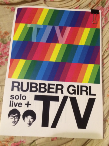 昨日行ってきました~~~!ラバーガール単独ライブ「T/V」!!!この日を楽しみに楽しみに、ほんっと~~~に楽しみに頑張って、親知らずの抜歯を乗り越え、出張を乗り越え、がんばったぞー!今後DVDで初めて見る人のためにネタバレは書きたくないのですが、、ちょっとだけ。ひとつひとつが繋がっていくのが凄い!もう1回最初から見たくなった!会場アンケートで、「今日の中で好きなネタは?」とあって、課金TVって書いてきたけど・・タイムスリップのネタも好きだなぁ。脱出のも好きだなぁ。もう全部好きだなぁ。それとね、大水さんのダンスと歌が生で見られる日が来るとは思わなかったですよ(笑)DVDを予約したので、9月まで楽しみに待ちます!本当に素晴らしい舞台でしたよ~!こんなに「面白い」にも色々種類があるんだなっていう(笑)終わった後は、映画を観終わった後のような脱力感。もっとその世界に浸っていたかった!早くもう1回見たい!物販があったので台本買ってきた♪脳内で飛永さん大水さんの声で再生されて、台本読んでいるだけで面白いですよ。ちゃんとね、相関図もついてるの(笑)謎水洋介のDVDもあったんだけど、ちょっと売り場前が混んでたので台本のほうに先に並び、そのままDVDを買わずに帰ってきてしまった・・なんか、当然のようにamazonとかで買えるだろうって思ってた(*_*)通販して~~!!お願い!!!イヤーー(+_+)次のライブも絶対行く!!
