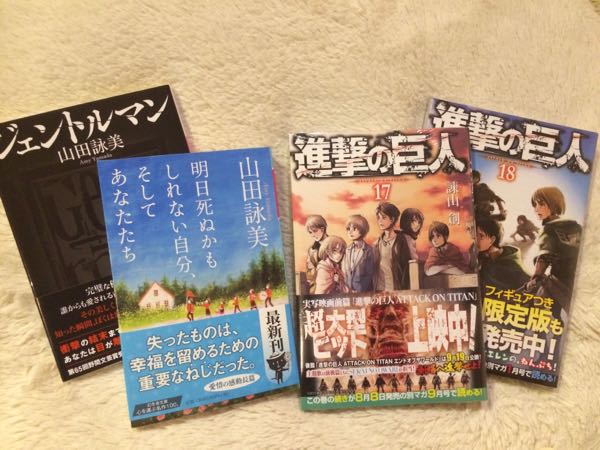 謎タイトルになってしまった。久しぶりに本屋さんに行ったので、文庫本を購入しました。山田詠美の「ジェントルマン」と「明日死ぬかもしれない自分、そしてあなたたち」です。ハードカバー用の本棚がパンッパンなので、文庫を待ちました…山田詠美は絶対ハードカバー派だったのにゴメンナサイ。それから進撃の巨人18巻も!17巻は8月の発売日に買っていたのに開けてもいなかった。毎月マガジンで読んでるからね。途中から電子書籍っていうのが嫌で、紙の本を買い続けているけど…100巻くらいまで行ったらどうしよう!(笑)他に買っている連載中の物は…暗殺教室は10巻で止まっているんだけど、本当に巻数が多くなりそうなので途中から電子にしようかな。こち亀は151巻で止まってるや。もう今何巻なのかもわからない…闇金ウシジマ君は最初から電子で買っているので、どんなに増えても大丈夫!もうすぐ35巻が出ます!電子は12月25日発売。あと、いくえみ綾のコミックは持っている紙の本も含めてすべて電子で買っています。連載中の「太陽が見ている(かもしれないから)」3巻が12月25日発売なんです。紙の本は9月発売なのにー。電子は遅いんですよね。「あなたのことはそれほど」も「私・空・あなた・私」も 「G線上のあなたと私」もあるし!どれだけ連載抱えてるんですか(*_*)もちろんすべて買っていますが、やはり電子は遅いので待ち遠しいです…。「あなたのことはそれほど」なんて3巻まで出ているのに、電子はまだ1巻ですよ!早く読みたい!