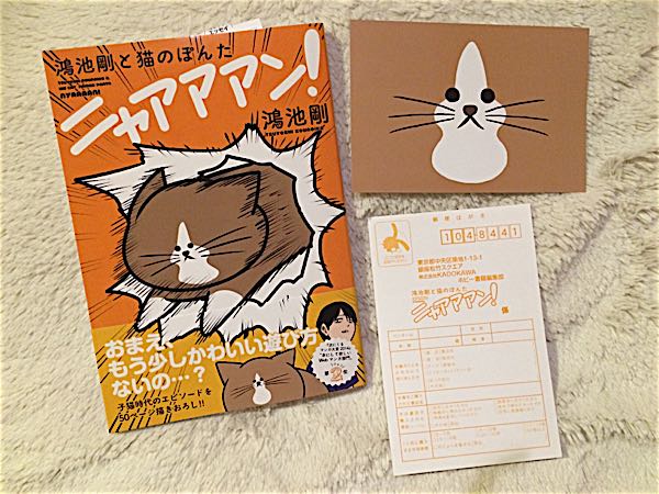 10月31日発売の「鴻池剛と猫のぽんた ニャアアアン!」!!夏から予約して楽しみに待っていたぽんちゃんの本です!アップするの忘れてた(笑)予約特典のポストカードが可愛い!ツイッターで大人気のぽんちゃん。ぴのに似ているので、振り回されっぱなしの生活には共感できてしまう!ずっと書籍化を待ちわびていたので、全国にぽんちゃん旋風が巻き起こっていて楽しい!ひそかに鴻池剛さんのファンでもあります(笑)既に20万部突破だそうで。めでたいめでたい!読者ハガキの切手欄のところに…ぽんちゃんが!可愛くて切手貼れないよ!裏面にも!読者ハガキは必ずせっせと書いて出します。生活すべて振り回されても、それでも可愛くて仕方がない猫!あ~うちの猫もやるやる…って場面ばっかりですよ(^^)