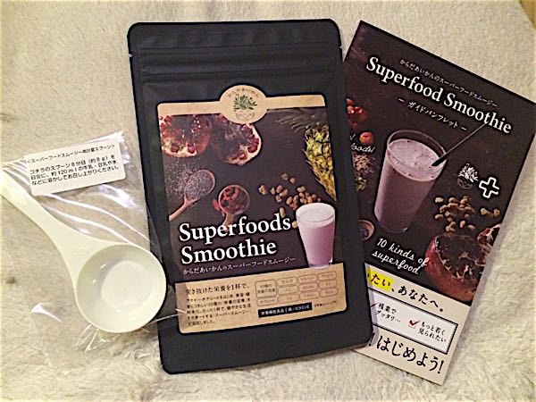 からだあいかんで買ったスーパーフードスムージーが到着!待ってました!牛乳で作っています。甘さ控えめだけど、飲みやすくて美味しいです。変な人工甘味料とか入れられたらイヤだもんね。肌の調子も良いし、飲みやすいし、また買います!半額クーポンがある時に買うとお得ですよ☆【送料無料】新発売!10種のスーパーフードをたった1杯で!粉末スムージーのもとからだあいかんの…価格:3,888円(税込、送料込)スムージーは色々試しているけど、これも美味しかった。牛乳や水の量で調節して、ジュースにもスムージーにもジュレにもなっちゃう。とにかくベリーの味が濃厚で、大好きだったのに!再販してくれない!今のところ、2トップで好きなスムージーです。