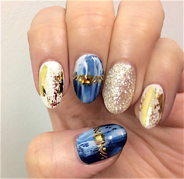 ジェルネイルの付け替えに行ってきましたー!!いやーーシンプル飽きた!早く派手なのやりたくて、2週間くらいで付け替えちゃおうかと思ったわ。担当ネイリストさんが空いてなくて、やっとサロンに行ってきましたよー。今回は、ブルーを使いたくて、でもあんまり青青したのは嫌で、、、ゴールドも使いたい!でもホログラムギッシリみたいのもイイ!と相談した結果、こんな感じのデザインになりました!凄い!青青はしていないしゴールドもあるしシルバーラメギッシリ!全体的にうるさくならないよう、服装や指輪に合わせて施術してもらいました☆ネイビーとホワイトのタイダイが宇宙から見た地球みたいでキレイ!!!(宇宙から見たことないくせに)ゴールドがエジプトとかの壁画みたいでキレイ!(壁画をキレイってこりゃ珍しいと言われた)ってずっと喜んでました(^^)白地にゴールドの部分は、金箔をペタペタ転写するんですよ。見た感じ、とっても簡単そうに見えるんだけど物凄くセンスがいる技ですよね。私がやったらベッターーってただ貼っただけになるわ。担当さんは本当にセンスが良くて、ストーンの置き方ひとつにもウットリしちゃいます。あ~~~満足!!!ネイルが新しくなると、気分が変わって良いですね!ゴールドのリングにも良く合うし、最高に満足!