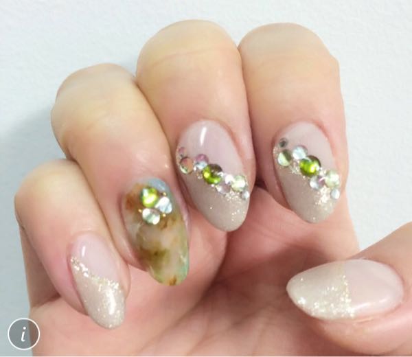 ジェルネイルの付け替えに行ってきましたー!今回は、担当ネイリストさんがデザインしてくれた大理石風のデザインネイルです!緑と青と茶色と白を少しずつぼかしながら混ぜていく様子を見ていたんですけど、あっという間に綺麗なタイダイになって凄かった…担当さんは本当にセンスが良くて大好き☆グリーンのストーンが綺麗です(^^)薬指以外はシャンパンゴールドの斜めフレンチで、シルバーのラメラインが入っています。ちょうどサファリ系のお洋服を沢山買ったので、ネイルに合うー!今回も大満足!思えば今のネイリストさんと出会って、1年が経ちましたね。センスの良さもスピードも丁寧さもテクニックもピカイチの素敵なお姉さまなんですよ。去年の今頃、大事な予定があったのにネイルが1本取れちゃって、他の指も浮いてるし、ど~~しよ~~~と困っていたところ…たまたま職場の近くにあったネイルサロンに駆け込みでリペアをお願いしたんですよ。電話したらちょうど空いていて助かったー!!!と出会ったのがこのお姉さま。1本のオフと施術で1時間くらい見込んで予約していたんですけど、簡単なフレンチかラメグラで良ければ、全部の指に施術できますよって言われてそんなに早くできるの?!って驚いたのを覚えています。オフとドライケアもやって貰って、綺麗なピンクゴールドのフレンチが1時間ちょっとで完成しました。しかもリーズナブルな料金のお店だったので、今まで行っていたサロンの半分くらいの値段で…ケアもオフも込みで…時間も半分くらいで…感激しましたねえ。3週間経っても、浮いたり欠けたり一切しなくて、長持ちしました。以来、ずっと指名して通っています(´▽`)今までオフ、ケア、ちょっと凝ったデザインの施術で合計3時間~3時間半はかかっていたんですけどね~。今ではどんなに凝ったデザインをお願いしても、2時間かからないです。高いサロンでも結構すぐ浮いちゃったこともあるし、どれだけ良いネイリストさんに出会えるかってことですねぇ!ネイルが綺麗だと、毎日ウキウキ手元を眺めて楽しいです(^^)
