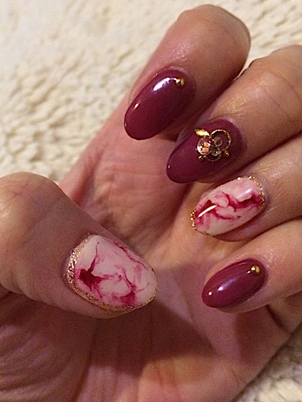 ジェルネイルの付け替えに行ってきました!紫っぽいカラーをベースに、マーブル!綺麗!マーブル部分は金ラメラインで囲んで貰いました☆夏にちょっとシンプルが続いたから、少し華やかな色合いにして貰いました。う~ん大満足!