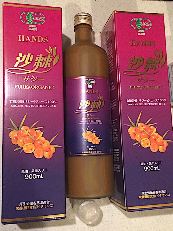 お母様が生理前後に不調な私のためにサジージュースをプレゼントしてくれました!沙棘(サジー)ビタミンACE、カリウム、カルシウム、鉄分、亜鉛、葉酸、食物繊維などなど200種類の栄養素が採れるスーパーフルーツなんですよ。しかも、1日30mlでいいんです。ひとくちですよ、ひとくち!命の母を飲んでも、ここ数か月ずっと調子が悪かったのですが、サジーを毎日飲み始めて1か月経って、とにかく肌ツヤが良くなった!(生理痛は)味は少しクセがあって、最初は「ウワ!苦甘酸っぱい!!」と味覚が混乱しましたが数日もすると慣れてしまって、酸味が美味しい♪生理前のイライラなんかもちょっとはマシになったかな。生理痛は残念ながら、あまり軽減されず…もうしばらく飲みます。旦那と1杯ずつ飲んで、ちょうど1か月で2本飲み切りました。肌への効果が凄すぎて、もう手放せないです。追加でまた買って貰おう♪サジージュース シーバックソーン ★ 【ハンズ サジー】有機JAS認定 サジージュース 100% 沙棘ジュース 900ml 2本セット栄養機能食品 ( ビタミンC )【HLS_DU】【RCP】