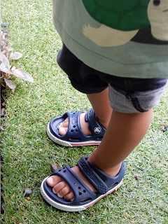 1歳7ヶ月、足も達者になった孫にサンダルを用意しました。つま先部分が開いた、一丁前のサンダル。C4(12cm)サイズからあるので、足の小さい孫でもピッタリと履けました。【送料無料】クロックス(CROCS) クロックバンド 2.0 サンダル PS(crocband 2.0 sandal PS) サンダル【ベビー & キッズ 子供用】【楽ギフ_包装選択】【r】【15】[AA]グリーンが欲しかったけれど、売り切れでネイビーを購入。でも、ネイビーは服を選ばなかったので正解だったかも。最近は、これを履かせていれば水に濡れたって平気。庭の水やりと一緒に、自分の足にも水を撒いています。履かせるのも簡単で、オススメ。シビッツは裏側が気になるかもと、あえて付けませんでした。でも、人気なんだろうなぁ〜売り切れのお店が多いようです。