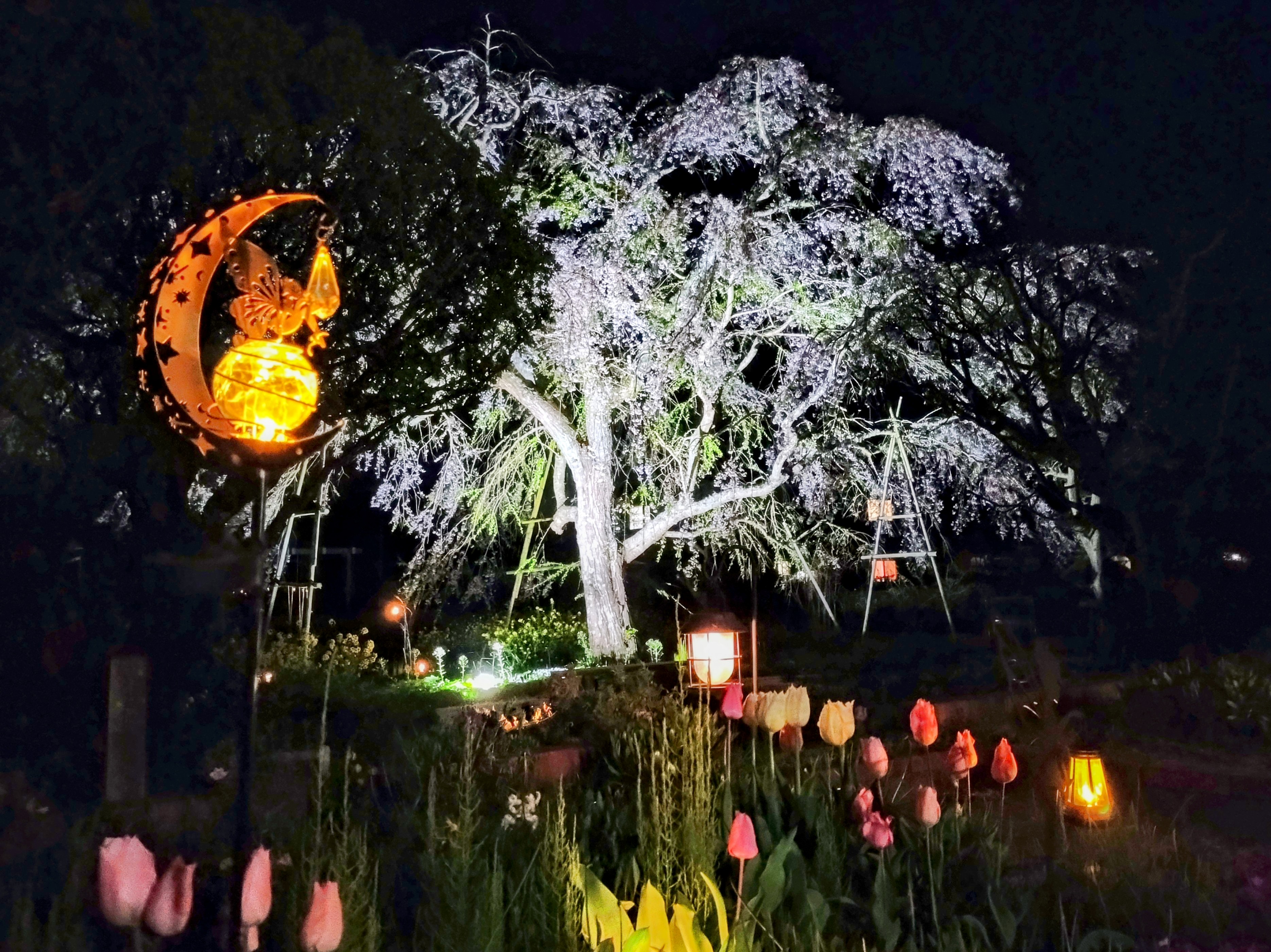 咲き始めは色が濃くてだんだん薄くなります。見上げると 高いので写真は無理😅機材も腕も🥶枝先はふんわり。我が家の窓明かり😅夜は妖艶な魔物系です🎉