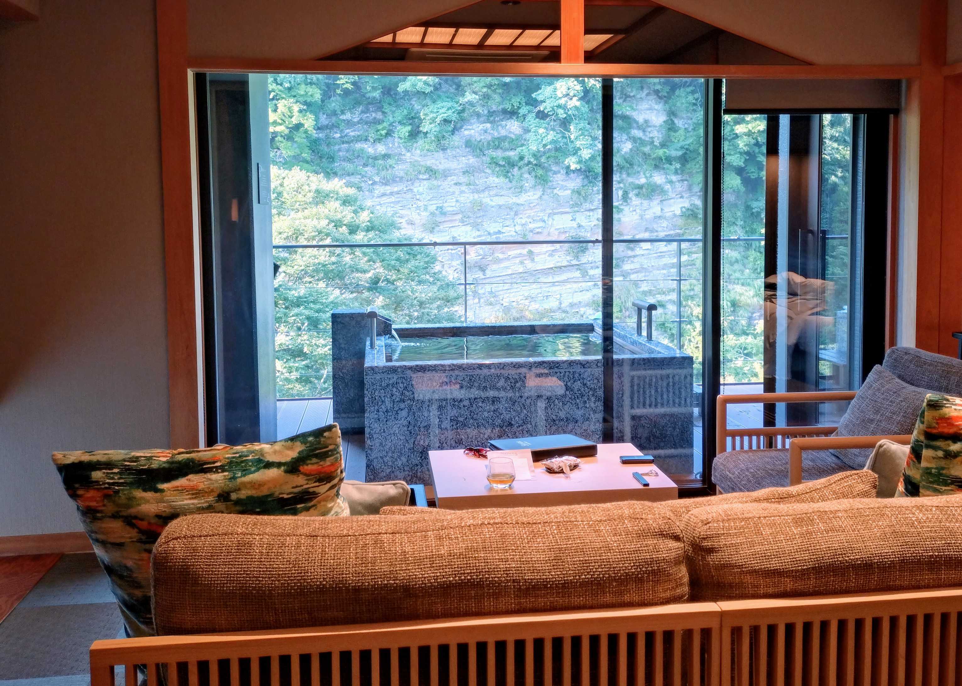 近くの温泉探検 クルマで30分くらいのところに新しい温泉リゾートホテルができました。渓谷の中に溶け込むように作られた、ラグジュアリーな温泉リゾート 洗練された空間と最高級のホスピタリティで、 全てが解き放たれる至福のひとときをお届けいたします。 との 宣伝文句❣️何だかすごく良さげ🥰 なので 行かなくちゃ だったのですが なんと 1人予約出来ない👿 ので致し方無し 家族3人で。古い旅館建て直して新規 らしいです。夫は知ってるらしく あそこね、くらいで。よって あまり熱無くてで ナビも雑に入れて 結果 危うく迷う所👿でした😡 間違い方向に曲がる直前 私が看板に気づいて事なきを🥶 ホント 世の中危険がいっぱい😰 ホテルはとてもわかりやすい場所にあってすべてのお部屋が露天風呂付き。3人で取ったので お部屋は広め。リビングフロア向こうに露天風呂 & 断崖渓谷 お湯は黒湯で中々良い🎉 別に貸切露天風呂あるとの事で 夫と息子はそちらへ私はお部屋のフリー冷蔵庫のビール飲みながら まったりお部屋風呂 極楽極楽🥰その後 ホテル内探検したがる息子とロビーへ。ここは飲み物もフリー おつまみも出てくる 本も少し 景色はこんな感じ。 ここでワイン飲みながら 本屋大賞候補作とかの本 読みながら まったりしてれば まぁ 時間はすぎる🫠いい感じに出来上がってたらご飯の時間だよ〜と 夫のお迎え😅 ご飯は個室ダイニング。前菜のお皿お肉のお皿伊勢海老のお皿お刺身のお皿バーニャカウダのお皿撮りそこねたけどご飯は土鍋でその場 とうもろこしご飯でした~。デザートが 爆笑予約した夫が 宿泊の目的に退職記念 と した 結果😁 本人企画😂😂 ちなみにダイニングでの飲み物は別料金。種類は割と多いけど。ワイン 何杯か🎉飲んで お腹はいっぱい 10時から バーも開くって言われたけどこんな感じのお庭前で お部屋戻ってお風呂もう一度入ったら お休みなさい でした~。朝ご飯は 和風&焼き魚。 オカズはどれもお代わり自由。 そんなには食べられません😅まぁまぁ 楽しかったけど 1人でいけないのはなーー🥶🥶使い勝手が悪いかなぁ。せっかく近いのに😅