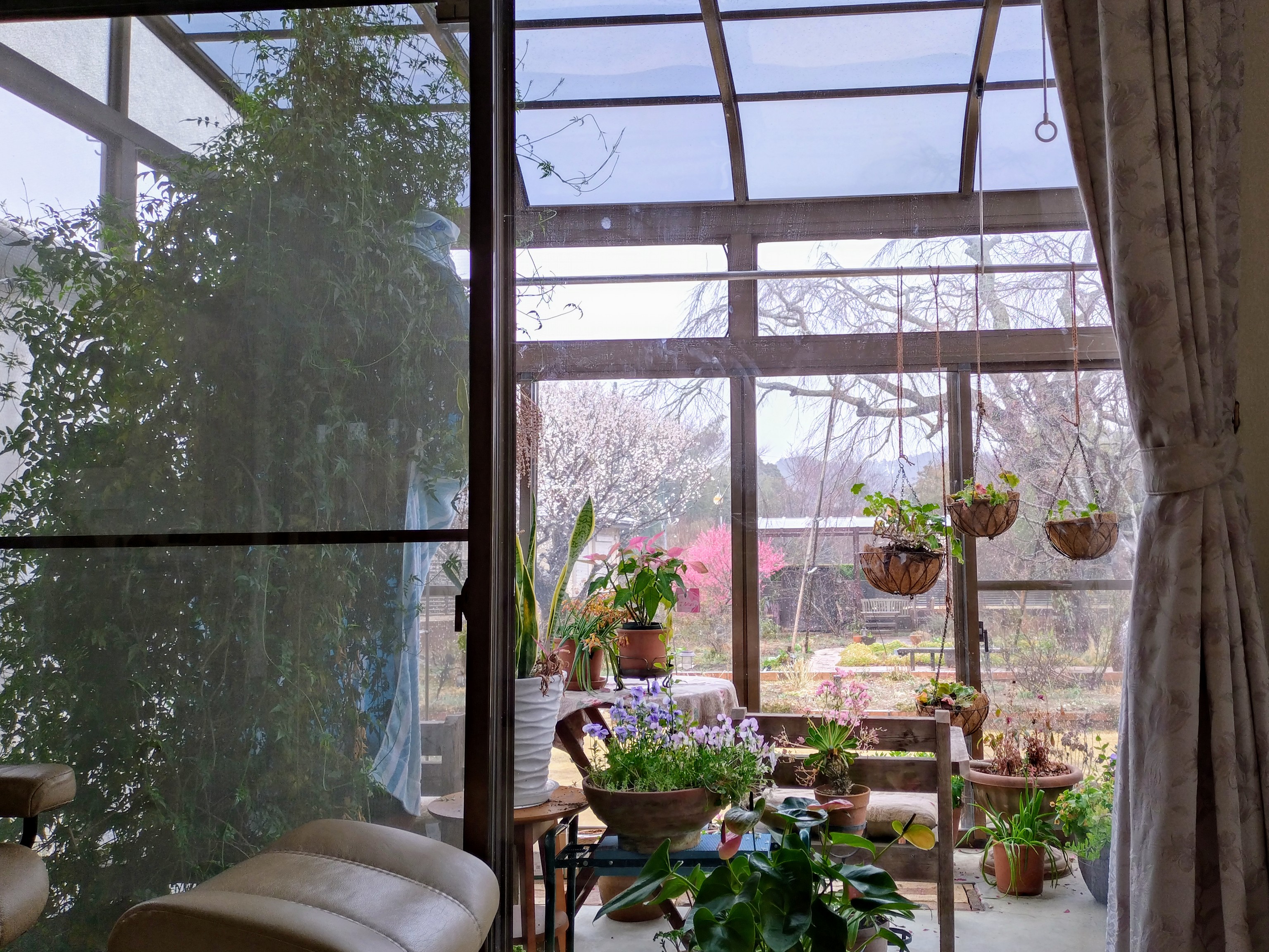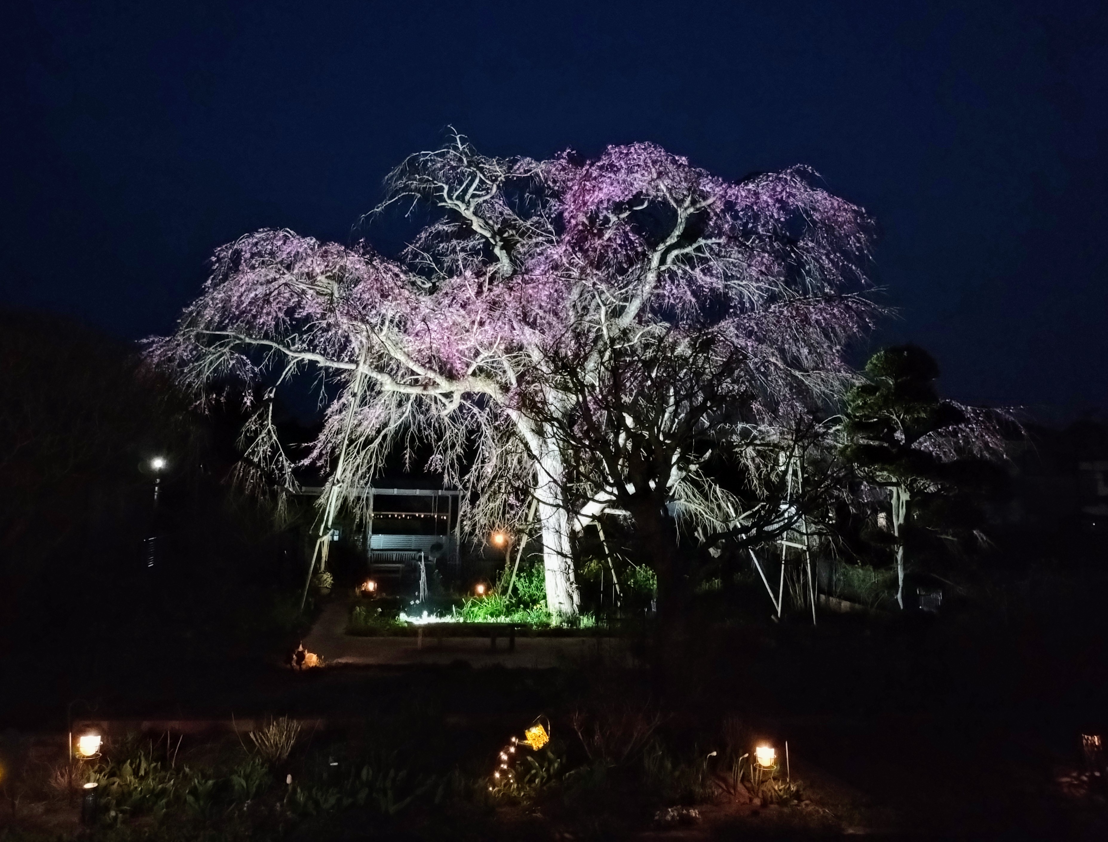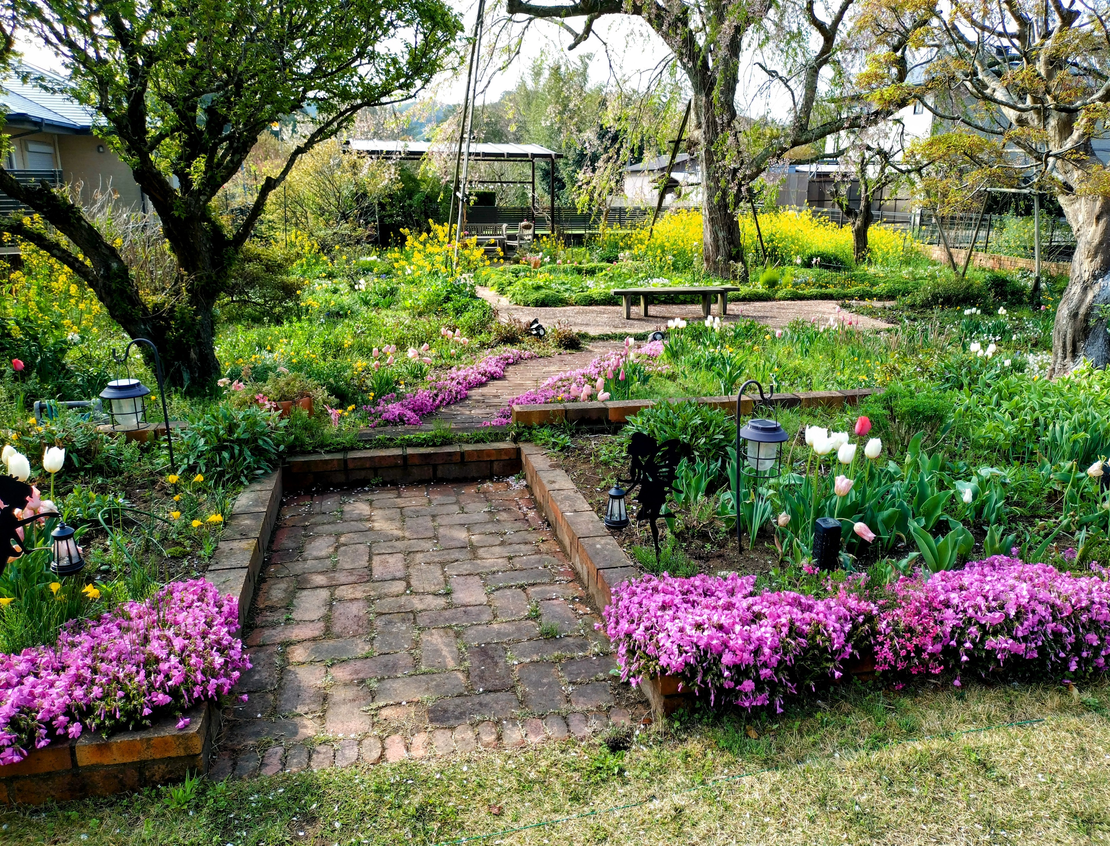 割と早い時の桜です。まだ花の色が濃い。チューリップも芝桜もこの時は冬気分桜は急に暖かくなったらすぐ開くけど他の植物は準備が間に合わないらしい😅一番先に桜に追いついたのは菜の花。とは言っても今年の冬の乾燥で株はだいぶ小さ目。庭向こうの大島桜もソメイヨシノも追いつき🥰さぁ 春だ🥰🥰🥰と 思っていたら冷たい雨🥶サンルームからの雨の桜。 雨が終わったらやっと暖かくなりました。花壇の芝桜やチューリップも追いついて。もうご飯は必ずサンルーム🥰賑やかになって来ました🥰🥰勿論 夜桜も楽しくて桜のお客様のお土産 桜ワインでまったりしたり。あまり上手く写真にならないのですがリビングの窓に映る花だらけの庭が好き🥰一通り庭で遊んでさぁ 家に入ろう とするとガラスに映る景色。あら もう少しだけ 遊びたい🥰で また 庭へ😅😅の 無限ループに嵌ってます。そんな中 こんな お客様。時々猫は来るのです。私は犬派なので出て行って貰います。だいたい 猛ダッシュで退場 なのですがこの子は どうも 走れないらしい。写真撮らせてくれました。いつの間にかいなくなっていたけど。芝刈りロボも稼働し始めました。さぁ 庭シーズン開始🥰🥰