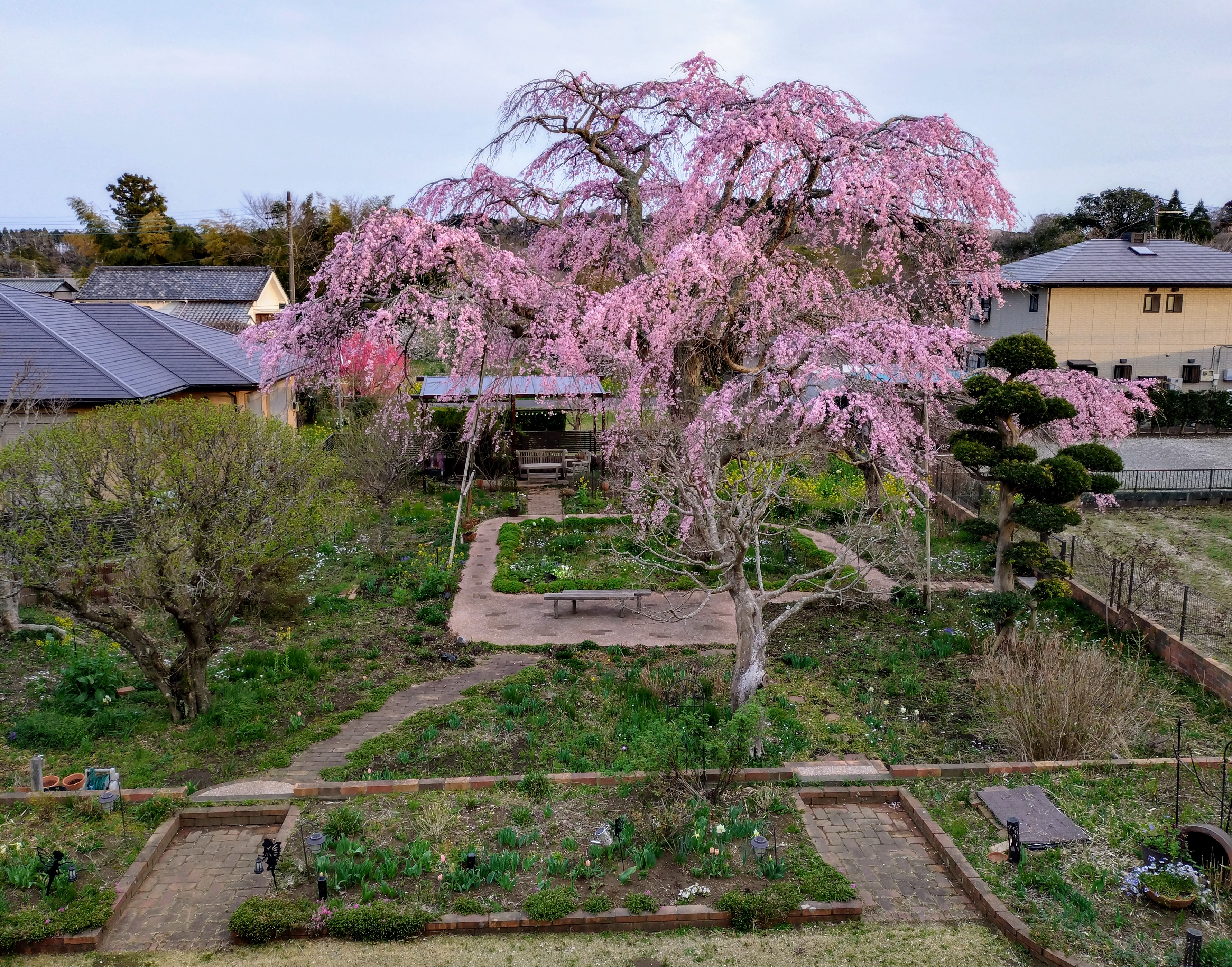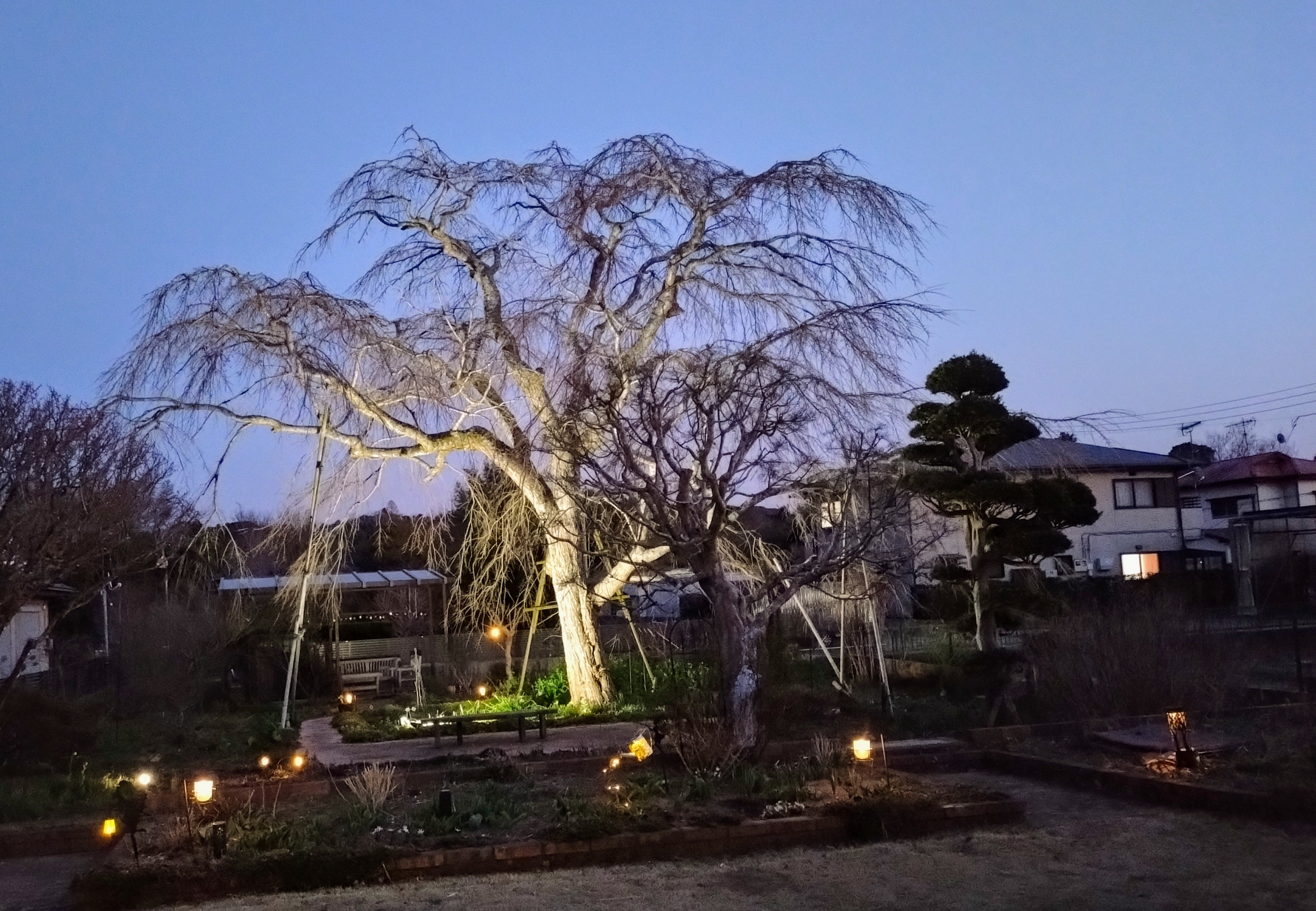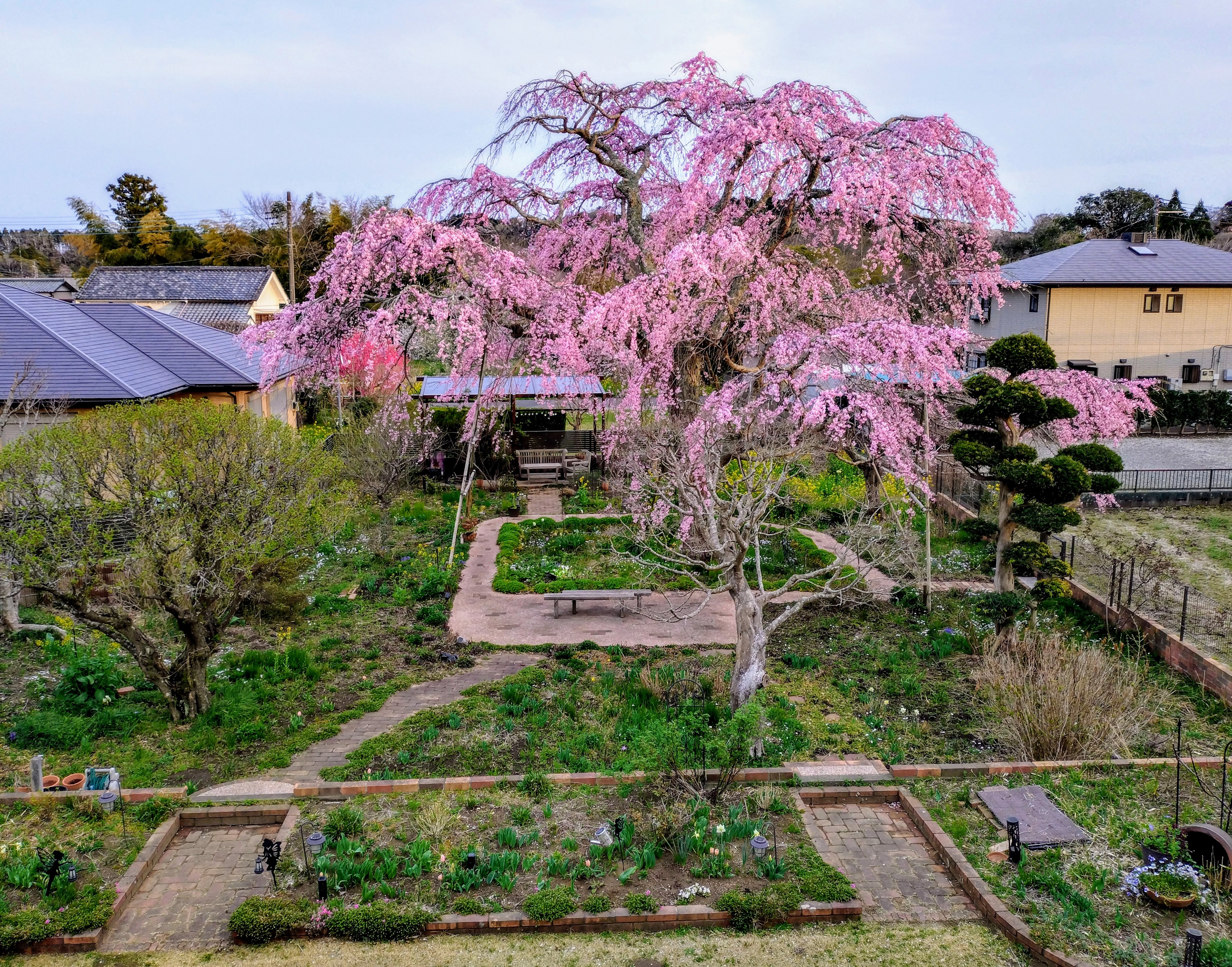 割と早い時の桜です。まだ花の色が濃い。チューリップも芝桜もこの時は冬気分桜は急に暖かくなったらすぐ開くけど他の植物は準備が間に合わないらしい😅一番先に桜に追いついたのは菜の花。とは言っても今年の冬の乾燥で株はだいぶ小さ目。庭向こうの大島桜もソメイヨシノも追いつき🥰さぁ 春だ🥰🥰🥰と 思っていたら冷たい雨🥶サンルームからの雨の桜。 雨が終わったらやっと暖かくなりました。花壇の芝桜やチューリップも追いついて。もうご飯は必ずサンルーム🥰賑やかになって来ました🥰🥰勿論 夜桜も楽しくて桜のお客様のお土産 桜ワインでまったりしたり。あまり上手く写真にならないのですがリビングの窓に映る花だらけの庭が好き🥰一通り庭で遊んでさぁ 家に入ろう とするとガラスに映る景色。あら もう少しだけ 遊びたい🥰で また 庭へ😅😅の 無限ループに嵌ってます。そんな中 こんな お客様。時々猫は来るのです。私は犬派なので出て行って貰います。だいたい 猛ダッシュで退場 なのですがこの子は どうも 走れないらしい。写真撮らせてくれました。いつの間にかいなくなっていたけど。芝刈りロボも稼働し始めました。さぁ 庭シーズン開始🥰🥰