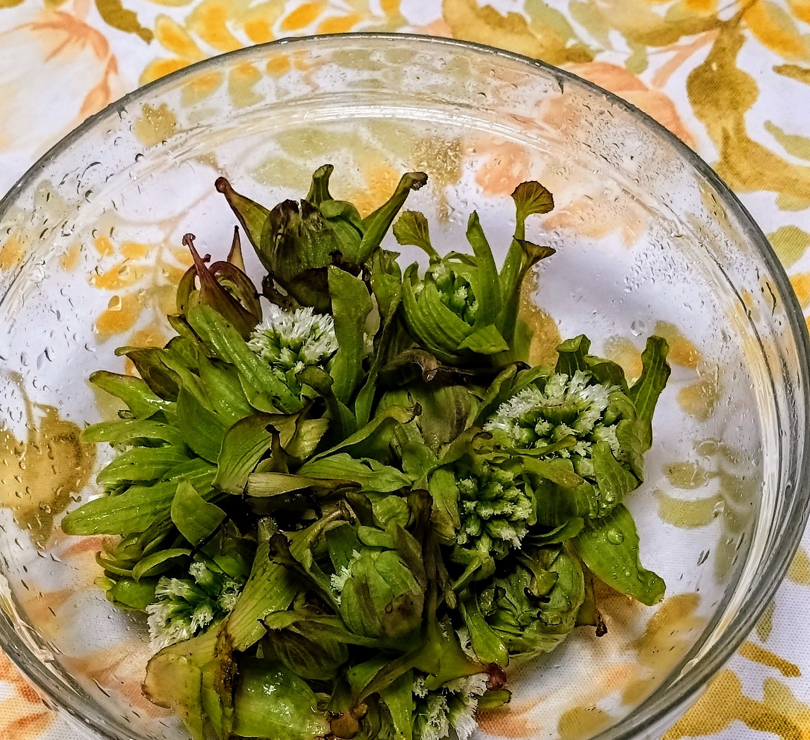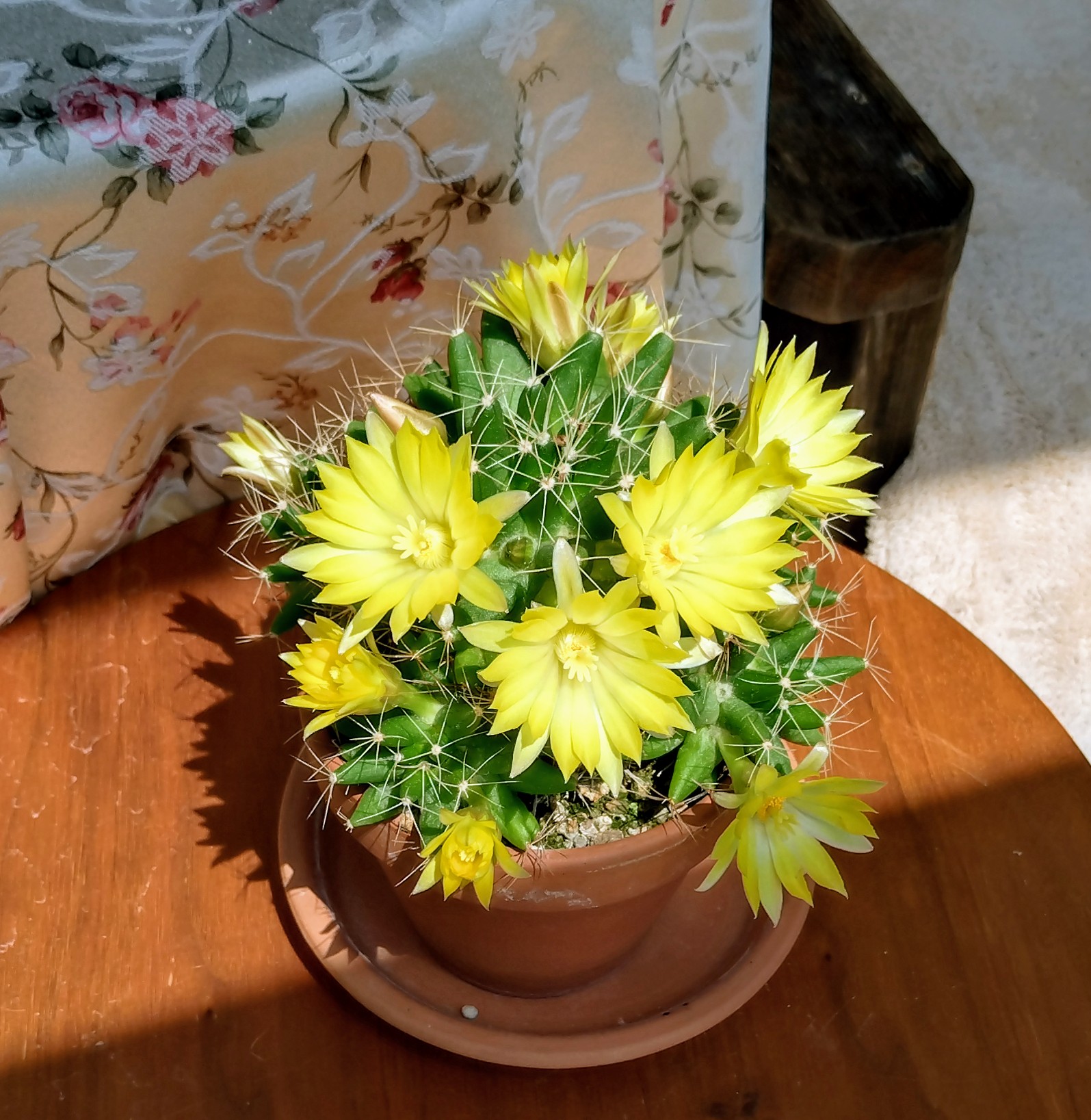サンルームでふと見るとあら サボテンにお花が😍マミラリアだそうです。グーグルレンズで。これは長男が中学生の時 タキイで買った種から育てた物。サボテン 種 ミックスなので正体不明。何種類か育ったり 滅びたり生き残った子が思いついたようにお花咲きます。最初1個咲いた時起業している長男の仕事が回りだした頃で。息子の元気とシンクロ?とか 思ってしまってます。さらにもう1回咲いた時も長男調子良くて。おお すごいぞ とか 思って。ここ何年か咲かず。で 見つけて にっこり なのです。 まぁ 母の勝手な思い込みですね~🎉今は長男が私のスマホにグーグルレンズ入れていったので調べられる。で アレコレ画像みるとこんな1個2個じゃ無くてぐるっと丸く咲いてる🙀ええ🙀 良いなあ😍😍こんな風に咲いたら可愛いなぁ🥳とか 思いながら もう一種類の生き残りこちらはエキノプスこれもグーグルレンズで。調べると 立派なお花咲くらしい🙀ええー 咲かないかなぁ🥴🥴来年 頑張って欲しい😡 とさんざん リビング眺めてサンルームに戻しついでに分けてある他の鉢もちらりとね。 見てみたらなんと咲いてる🎉🎉しかもぐるっと蕾が😍😍きゃー 何が起こったのかしら🥳🥳 開くのが待ちきれなくて公開です😍実は台風報道で お茶のお稽古諦めて家で やること無い😡😡 しかも雨風 あんまり😡😡あー悔しい😡😡 の 1日なのです😡😡昨日夕食 おうちで大人しく冷蔵庫整理 玉ねぎとじゃがいもツナのチーズ焼き 焼きナス 青椒肉絲 大根おろしに明太子のっけ お味噌汁はお豆腐とワカメ。勿論 with ワイン🥳