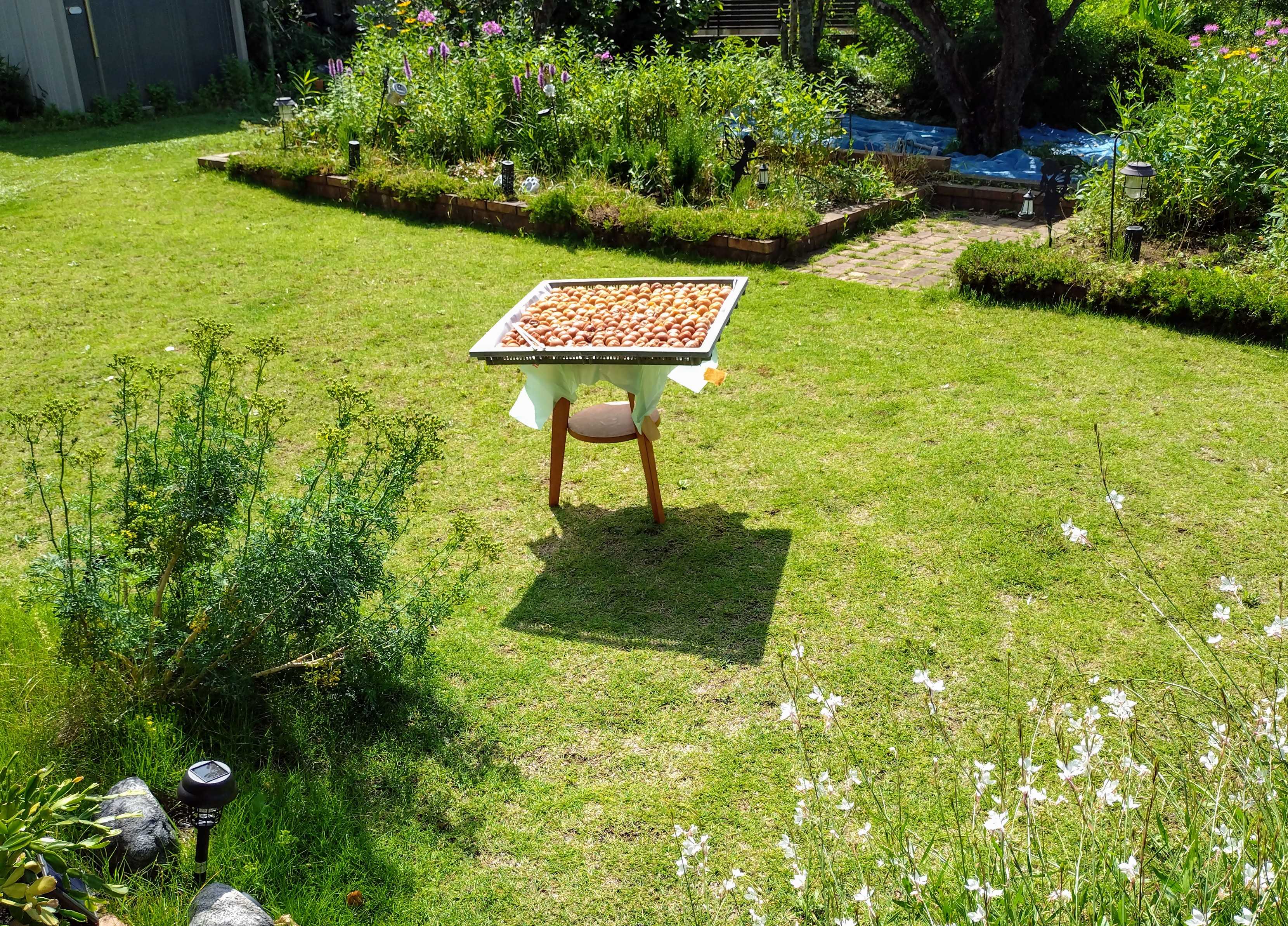 今年は春のお天気が慌ただしかった😅梅が終わったかと思ったら寒さがきたりして 桃はちっとも咲かなくて結局桃と桜は一度に咲きました。とは言っても我が家の桃 杏は高さ調整中。2階の寝室の窓の高さに。お花はいつもと比べると少な目でした~。杏の実はいつも殆ど紅く成らず落ちます。 受粉出来ていないのだと思ってます。これは頂き物の苗で 二本セットでした。多分 お互いが受粉相手の品種。 が植えたら 美味しかったのかピッピが一本食べてしまいました😅残った一本はぐんぐん育ち通常 実をつけない花桃扱い🥳でも桃と桜が重なる時は 油断大敵😰何処かのお花の花粉受け取るらしくなかなかの量の杏 落ちて来ます🥶今年は お花が少ないから まぁ 大丈夫かなぁ でしたがふと 庭見たら わぁ 結構落ちてる😰😰慌て拾って 無農薬 放置の生り物なので こんなです。 皮剥いたり 傷取ったりしてキレイな所だけ集めて 煮ます。 姉がすごく喜んでくれる杏ジャム 出来上がり。何日か 拾っては 煮る🥳 で杏に追われていたら梅が黄色くなってきて今年は豊作の気配😰毎朝 毎晩ザル持って 収穫。 だいたい2杯強梅干し作ります😅 ジブロックパックで塩漬け1日分。 重しかけなくても1日に何回か触ってやれば ちゃんと水上がって来ます。 朝晩2回。 毎日溜まって行きます🥶その間にも ドクダミが干し上がる😰ので 切って 中華鍋で炒ります。乾燥剤と共にジブロックパックで保存。なかなか 作業が多いです。アレコレしながら 庭で遊んでいると 忙しいけど 一層 庭が 可愛い😍芝庭にヒメイワダレソウがせめて来て お花が咲いて なかなか 良い感じで嬉しい🥰ブルーベリーももうすぐ😍緑 滴る です✨