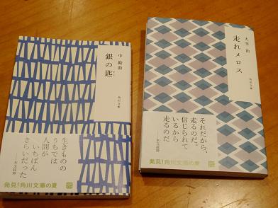 ふと立ち寄った近所の本屋さんでそこだけ雰囲気が違う一角を見つけました。 (人間失格 太宰治 、走れメロス 太宰治、 こころ 夏目漱石、 ポケットに名言を 寺山修司、 太陽の子 灰谷健次郎、 銀の匙 中勘助、 銀河鉄道の夜 宮沢賢治、 瓶詰の地獄 夢野久作、 蜘蛛の糸・地獄変 芥川龍之介、 堕落論 坂口安吾)こんなふうに平積みにして文庫が並べられていました。手にとってみたくなる装丁です。てぬぐい専門店「かまわぬ」と角川文庫のコラボのスペシャルカバーだそうで、今年は新柄7冊を含め全10冊があるそうです。「かまわぬ」とのコラボは数年前からやっているそうですが、今年初めて知りました。私は以前から読んでみたいと思っていた中勘助の『銀の匙』を迷わず選びました。もう一冊は柄が気に入ったし、もう一度読んでみたいと思った太宰治の『走れメロス』を選びました。「かまわぬ」のデザインもすごく好みだし、限定ものに弱いので、ついついお財布のひもがゆるんでしまいました。そういえば、新潮文庫のスペシャルカバーを数年前にも買ったことがあることを思い出しました。太宰治の『人間失格』です。三島由紀夫の『金閣寺』です。どちらも普通のカバーの文庫を持っていたのですが、素敵な限定カバーに惹かれて買ってしまいました。ピンクの太宰、ゴールドの三島、どちらもお気に入りです。今日購入した2冊の文庫も私のお気に入りの本になりそうです。*今日のこれいいな*銀の匙中勘助明治時代の東京の下町を舞台に、成長していく少年の日々を描いた自伝的小説。夏目漱石が「きれいだ、描写が細く、独創がある」と称賛したそうです。最後まで読んでくださってありがとうございます。「おもしろかったよ~」「その情報ちょっといいかも~」と思っていただけましたら、下のバナーをクリックしていただけたら嬉しいです!↓ ↓ ↓にほんブログ村