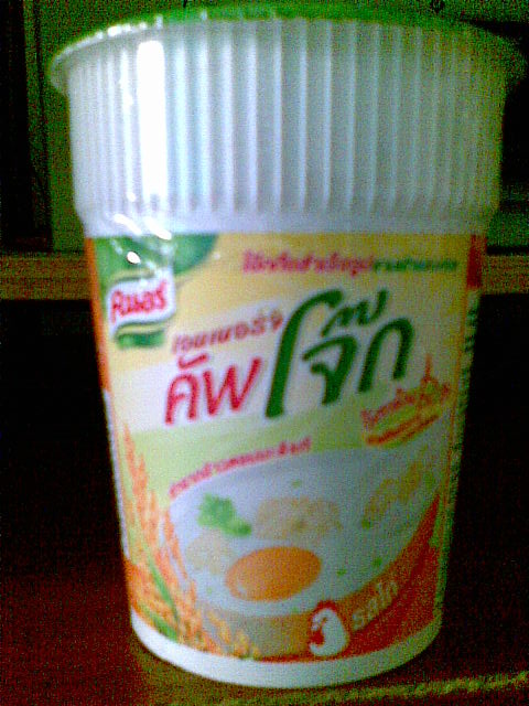 今日は朝から豪雨 屋台まで行って濡れるのもいやだし屋台で買うと20バーツ(ひき肉入り)大盛り25~30バーツ(卵・ひき肉入り)で・これはなにか? タイ語では「Jok」ジョク カップジョクおかゆをコトコト煮込んだ物米から出来ているので、粉々になっていますお湯を注いで待つ事1分出来上がり ジャスミン入り御飯(香りが良いです)鶏肉と卵入りカルフールでもタイ料理のコナーがあるので売っているとの事です。 私はジョクを食べて5キロ痩せました (2ヶ月間で週3回)男なのでダイエットしても余り意味が無いのですが、最近、更なるダイエットに挑戦してます
