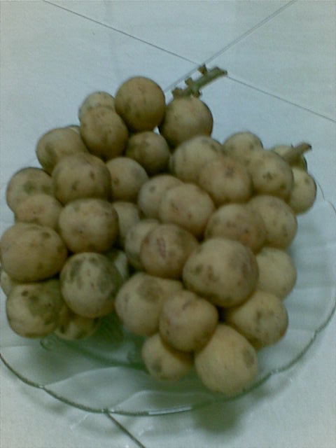 名称はラーン・サートなのかロンコンわかりません茶色系の薄い皮でウズラの卵みたいな果物皮をむくと4・5個の果肉に分かれていますで味はと言うと甘みの中にグレープフルーツのような酸っぱさ1キロ35バーツです(3.54円/1バーツ)はですけど皮をむくとネバネバ感が指先にあるかな。ネバネバがなければ良いんですがね日本では販売してないと思いますが、とっても美味しい果物です タイらーめんを食べてからこいつを4分の1食べましたダイエット・ダイエット日本で食べれない時はごめんなさい又、タイに来て食べてください。追伸:タイではタバコの税気が上がりました私が愛用はマイルド・セブン(スカイブルー) 1箱90バーツ。タイで食べるタイらーめん1一杯30バーツ。1日2箱らーめんが6杯食べれ るんですよ