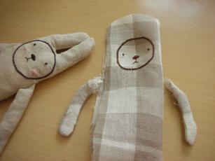 ぴょこぴょこ~んバックの端っこにひっかけてみましたこないだ作ったコです。知り合いの子供ちゃんにあげるはずなのに未だに家におりますなぜかというとなんだか手放すのが惜しくなって…と言う訳ではなくプレゼントするお宅にもう一人お子さんがいるのでケンカにならないよう(要らぬ心配!?)もう1匹作ることにしたのです。新しいコはチェックのリネンで。顔の刺繍が出来上がったのでこれから本体を縫い始めます今日はひさ~しぶりに気持ちよく晴れたので洗濯 布団干し お掃除などなど汗だくで頑張りましたそれがさっきやっと終わったので今からちくちくタイムです夕飯の支度をはじめる時間までに出来上がるかしら…