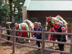 ホントにしつこくてスミマセン…先週の3連休に行った東京競馬場での模様をアップしますこのところ、競馬の世界では秋の大きなレースが毎週行われています私が観に行った【マイルチャンピオンシップ 南部杯】は本来なら岩手県の盛岡競馬場で行われるレース。今年は震災の影響もあって東京で開催されることになったのだそうです。当日の売り上げの一部は被災地支援に拠出されるそう。ならば!馬券いっぱい買いましょう!!!(言い訳!?)岩手県から来てくれた【チャグチャグ馬コ】の綺麗なコたち【チャグチャグ馬コ】とは馬の勤労を感謝し、無病息災を祈願するお祭りだそうです。東北地方の方々の生活が馬と近くにある事を改めて感じました。そして私の大好きな誘導馬のお出迎え。馬の姿を見つけるとわらわらと人が群がりはじめますもちろん私もわらわら(笑)みんなにナデナデされても嫌がる素振り無し。鼻の先っぽが柔らかくて気持ちいい~パドックどのコが勝つかな~ここで予想を決めます。だんなさんは新聞片手に真剣。私は「ベロ出してる~」「白くて可愛い~」て具合なのでもちろんめったに当たりません(泣)…まぁ真剣なだんなさんもそうそう当たりませんけどネそんなこんなでお昼タイムです迷ってしまうほどたくさんのお店がありますが…だんなさんは迷いなし。大好きなステーキ丼ガッツリ食べておりました。メタボ一直線…(泣)競馬は1日に12レースありますが1番大きなメインレースは11レース。3時30分頃スタートですすごい人~!!!この日の南部杯は見事、1番人気のトランセンドさんが勝利。私たちは揃って惨敗でしたが1日楽しんだので満足デスただ1つ残念だった事は…岩手競馬からやって来たロックハンドスター号が慣れないコースに適応できず骨折してしまったこと。サラブレットの骨折は生死にかかわる事も多く残念ながらロックハンドスター号は予後不良(安楽死)となってしまいました。後で知ったのですがこのコの名前がロック【岩】ハンド【手】スター【星】【岩手の星】という意味で地元では名前通り大活躍していたのだと聞き涙が出ました。競走馬として一生懸命走って被災地の希望の星だったロックハンドスターただただ冥福を祈るばかりです。